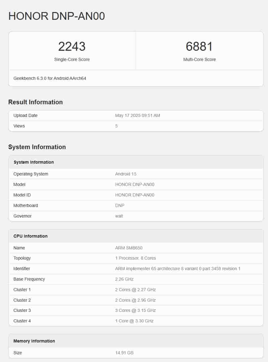 Honor 400 Pro (Chinese variant) now spotted on Geekbench with Snapdragon 8 Gen 3, MagicOS 9, 14.91GB RAM and more