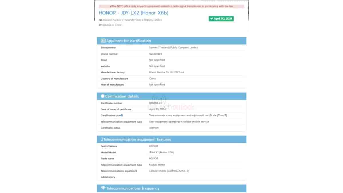 Let me start off with the NBTC certification. It shows up with the model number “JDY-LX2” and reveals the moniker Honor X6b 4G once again. It is listed with the certification number “B38308-24” and was issued on April 30, 2024. Further examination of the certification under Telecommunications Equipment shows “Cellular Mobile (GSM/WCDMA/LTE),” confirming it to be a 4G smartphone.