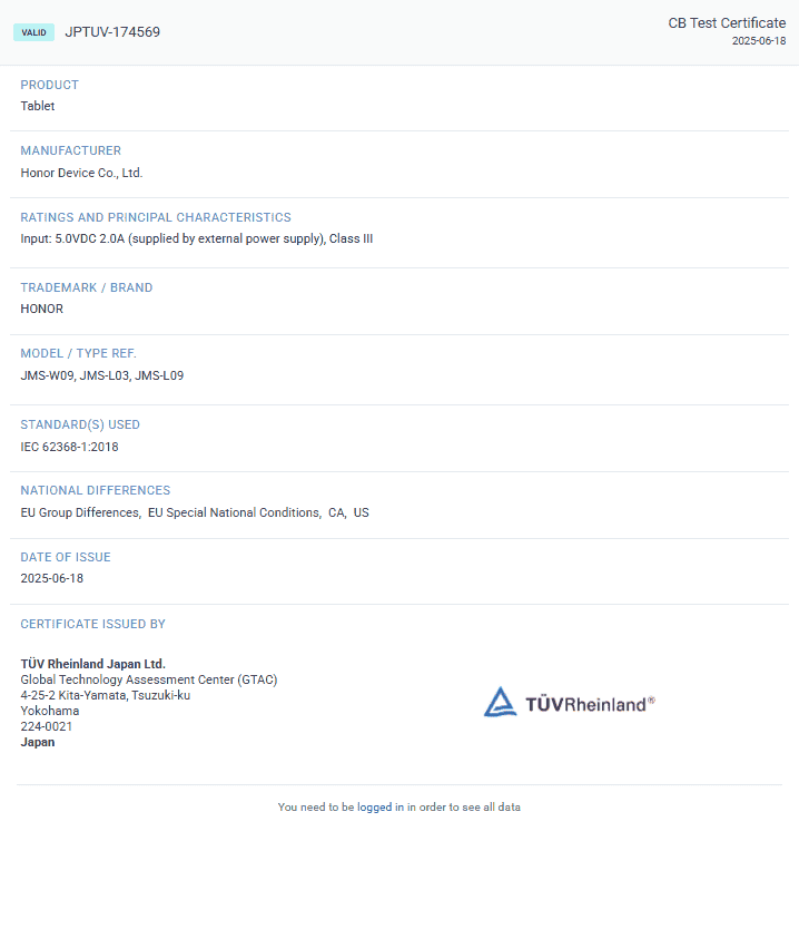 We have also found this model number on the TÜV certification website, along with two additional model numbers: “JMS-L03” and “JMS-L09.” These could be the LTE variants of the tablet, as the TDRA certification indicated that “JMS-W09” is a Wi-Fi-only variant. The certification also shows support for 10W wired fast charging.