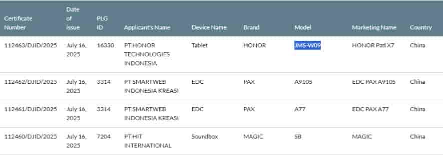 It has appeared on the SDPPI certification with the model number “JMS-W09” and the moniker Honor Pad X7, which previous listings had already confirmed. Its appearance on the SDPPI certification suggests a launch in the Indonesian market as well.