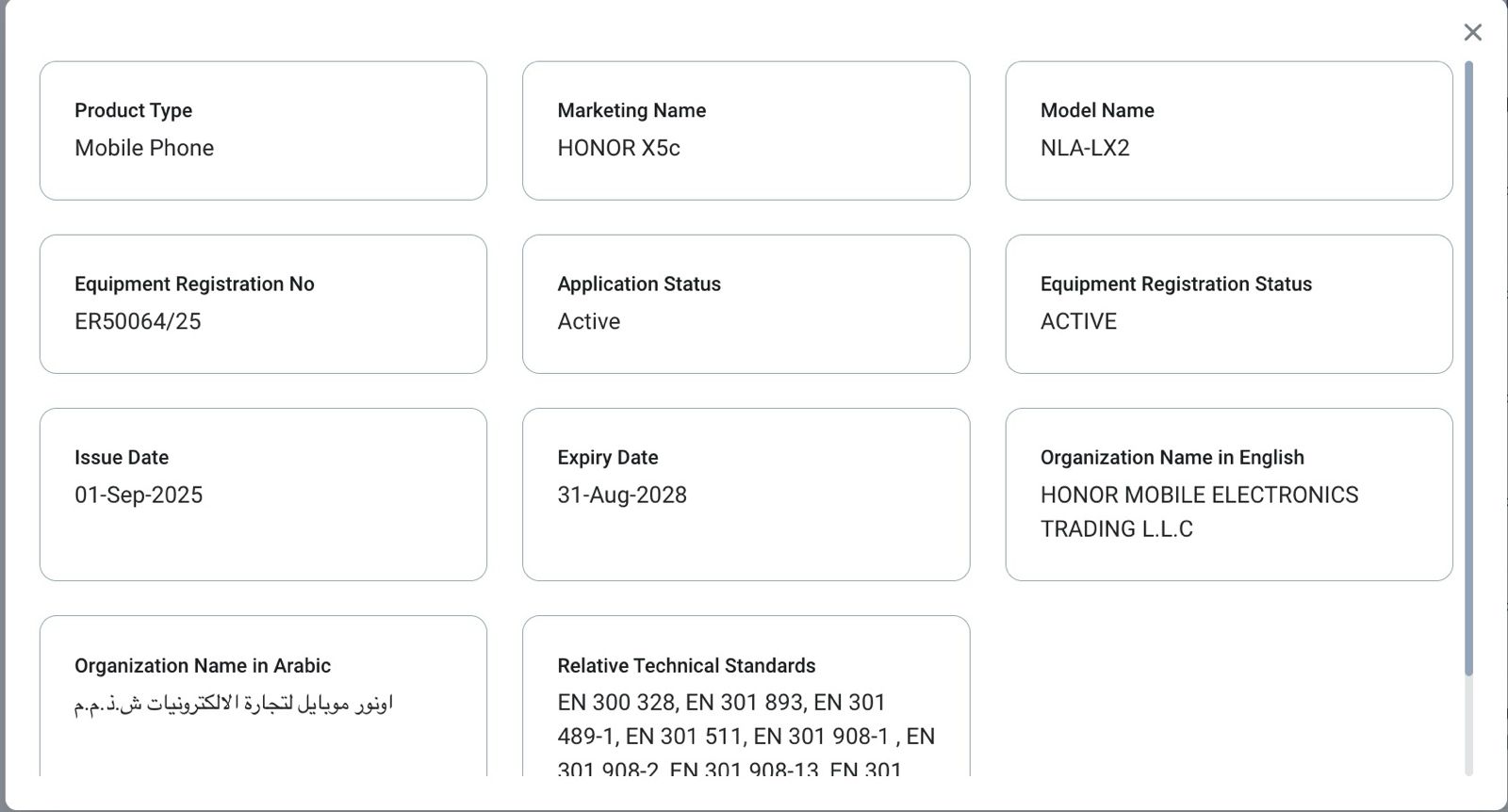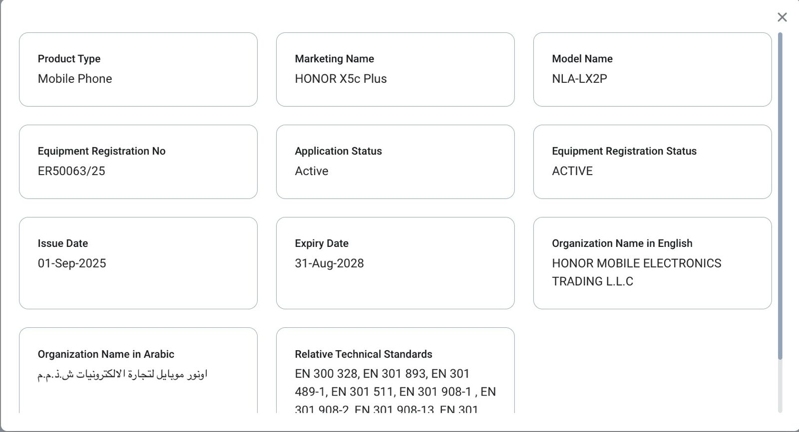The upcoming Honor X5c and Honor X5c Plus smartphones carry the model numbers of ‘NLA-LX2’ and ‘NLA-LX2P’, and these two have received the TDRA certification with the equipment registration numbers of ‘ER50064/25’ and ‘ER50063/25’, respectively. On the certification database, the monikers of both these smartphones have been listed, and they are categorized as ‘Mobile Phones’. Also to note, their TDRA certification will only be valid till the 31st of August 2028.