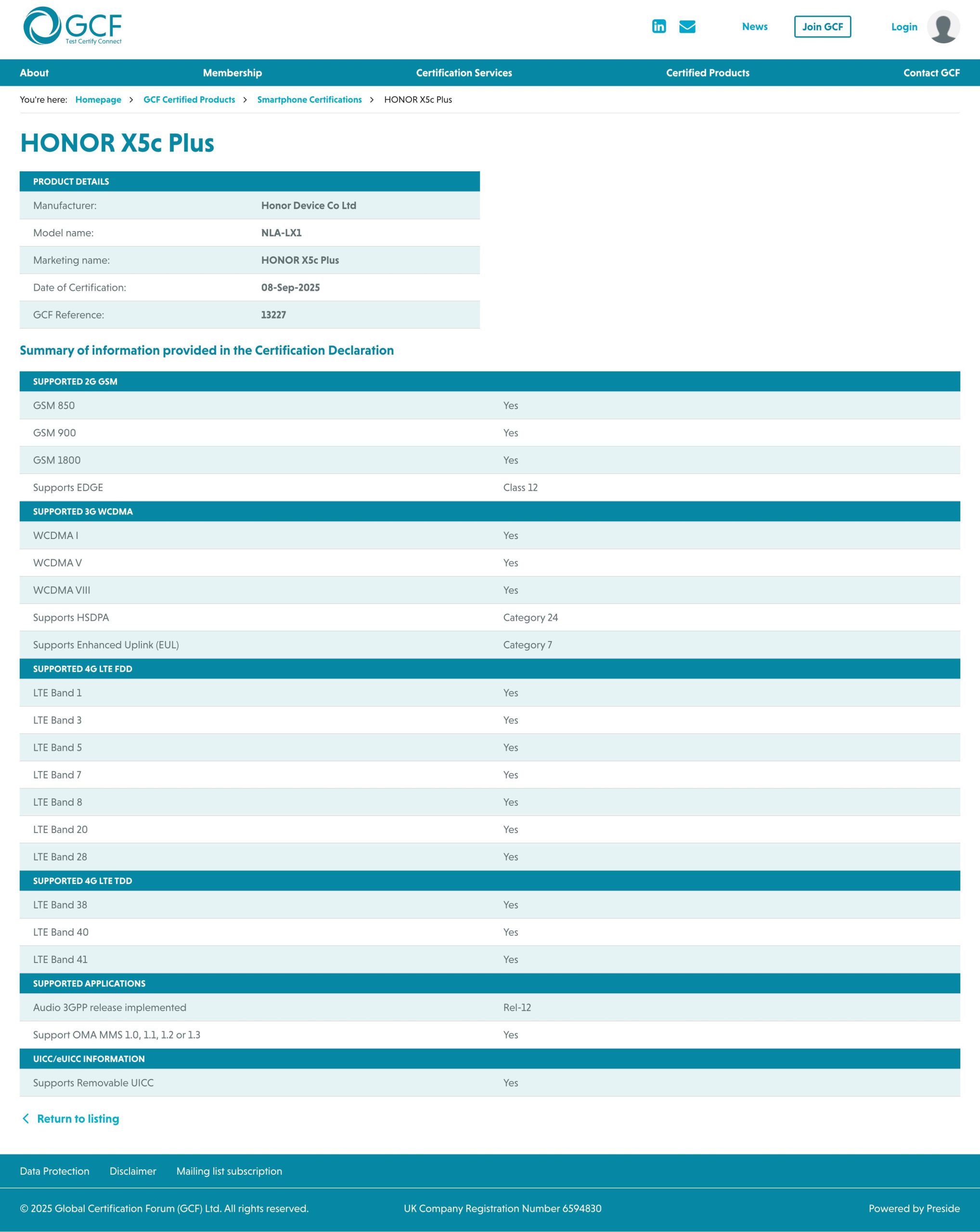 Our team at The Tech Outlook has spotted the Honor X5c Plus 4G device on the GCF certification website with model number NLA-LX1.