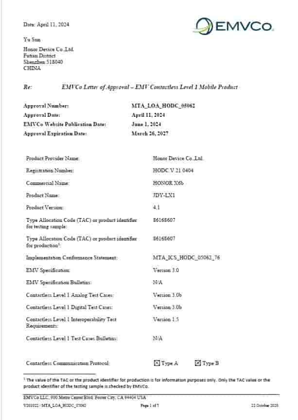 Honor’s upcoming 4G smartphone named Honor X6b 4G has been earlier spotted on IMDA, NBTC, and GCF has now received the EMVCo Letter of Approval for a contactless mobile product. This smartphone appeared with the model number JDY-LX1 and approval number MTA_LOA_HODC_05062. This approval confirms that the smartphone meets the required standards for secure and interoperable contactless transactions. It will run Android 14 out of the box and will also support NFC for contactless payment. This approval brings the smartphone one step closer to its launch.
