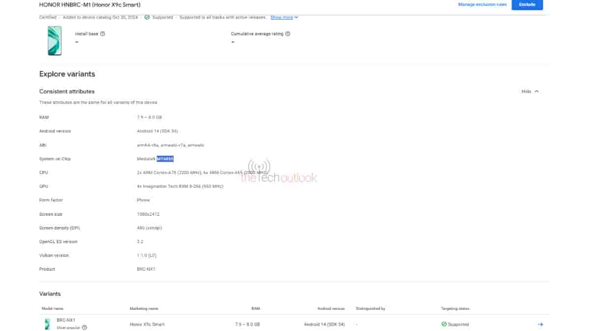 The Honor X9c Smart device carries the model number – ‘BRC-NX1’ as per the Google Play Console listing and it is the 8GB RAM variant that has appeared on the database. The device is pointed out to feature the Android 14 operating system on it, with MediaTek’s MT6855 chip having 2.20 GHz primary clock speed, Imagination Tech BXM 8-256 (950 MHz) GPU, and 1080 x 2412 pixels resolution display.