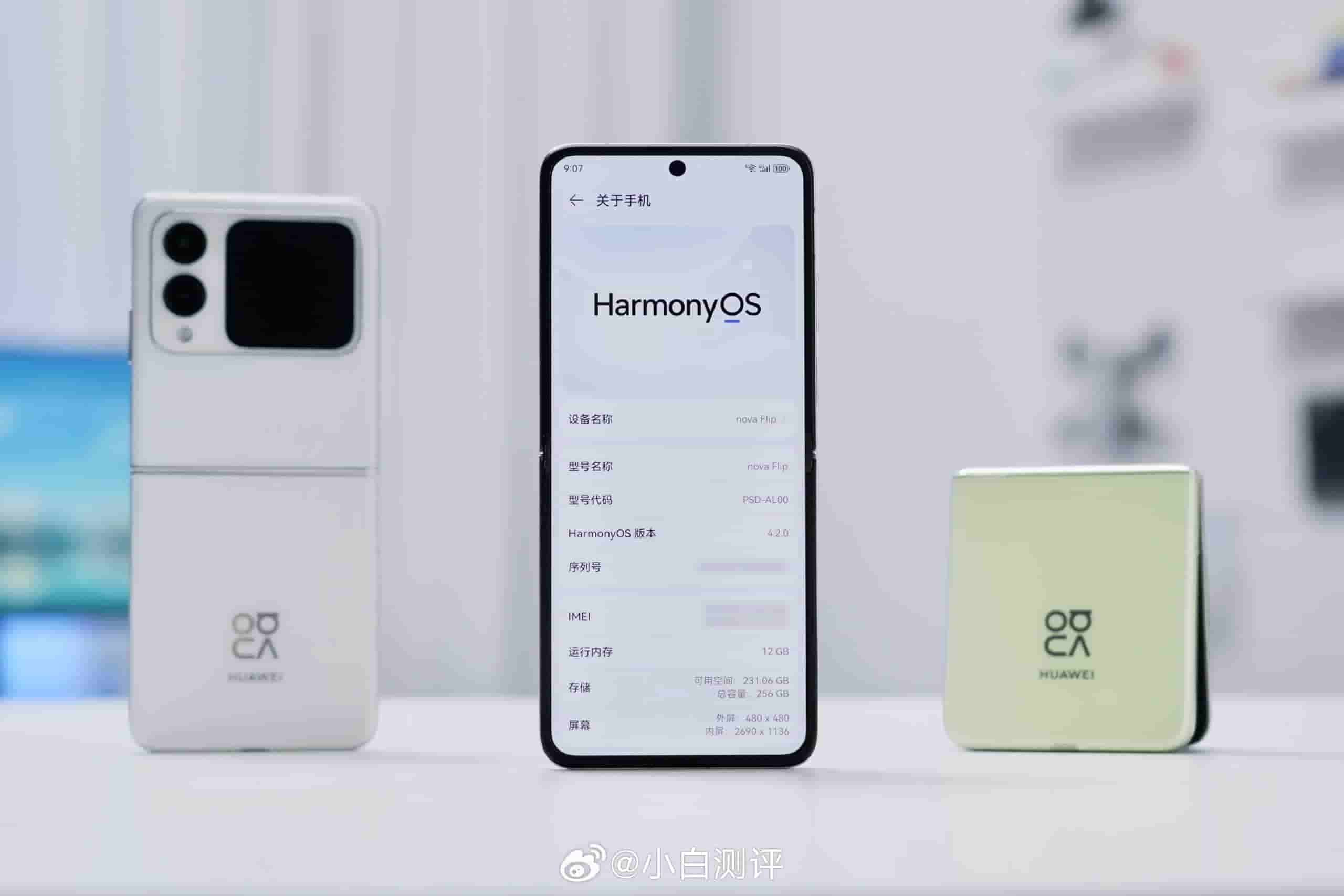 Another Weibo user named Novice Evaluation has shared several shots of Nova Flip’s phone. The images shared show the smartphone in four different shades. It also shows the punch hole cutout flat display with equal bezels around the display. The image suggests that the smartphone will come with a cover screen of 480 x 480 pixels resolution (2.1-inch screen) and a main screen of 2690 x 1136 pixels resolution. It also shows that it can come pre-installed with the HarmonyOS 4.2 version.