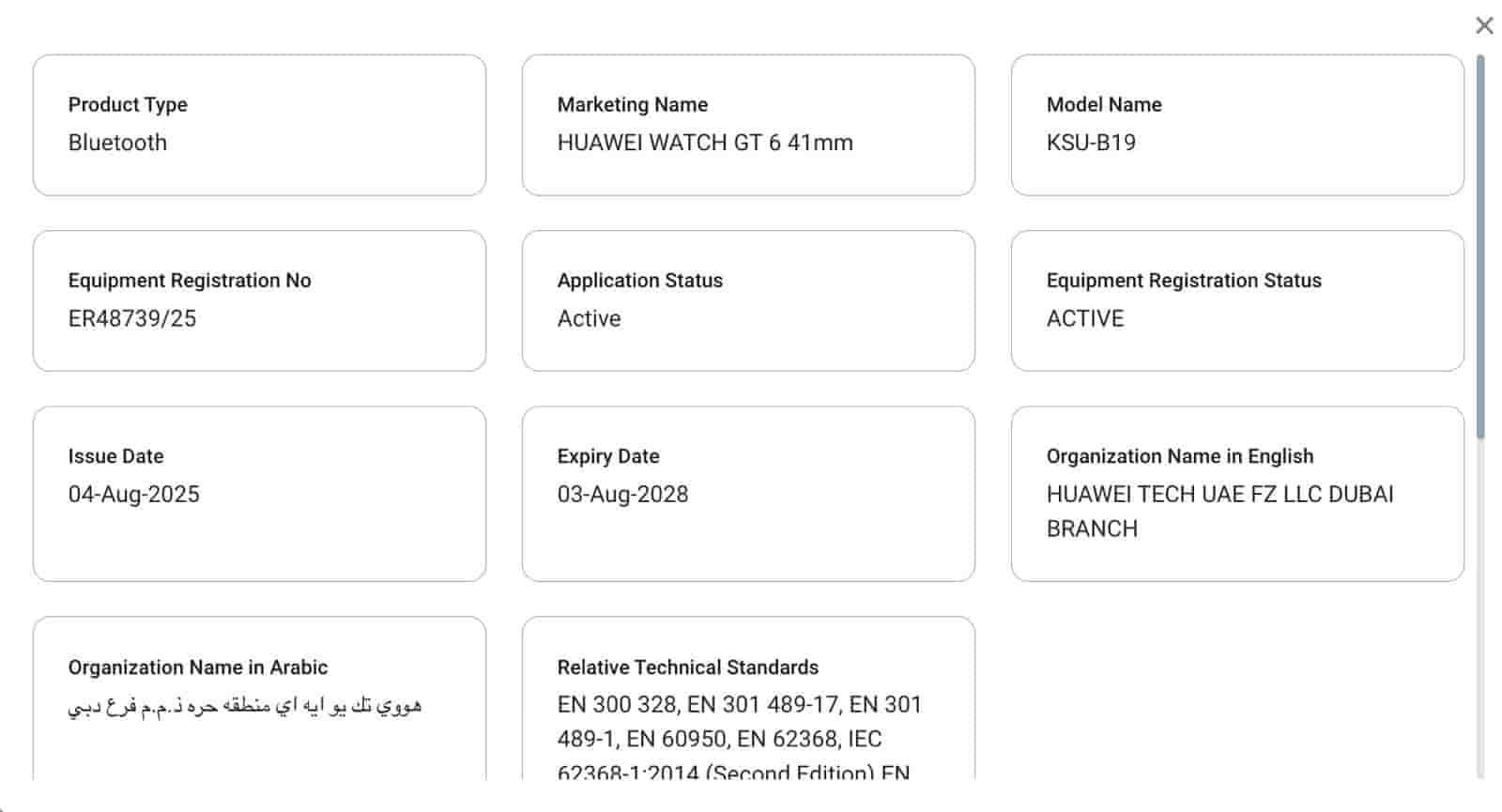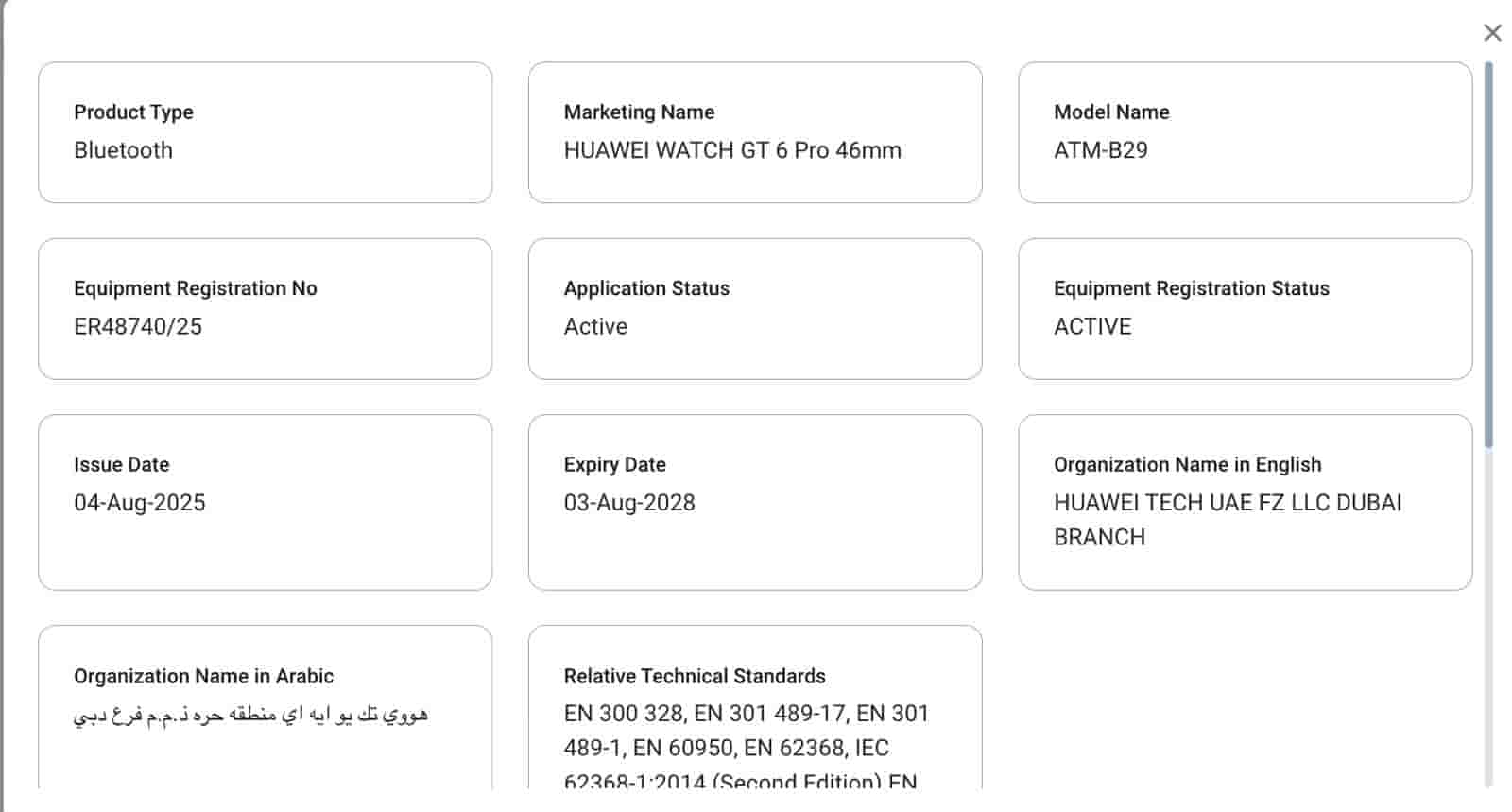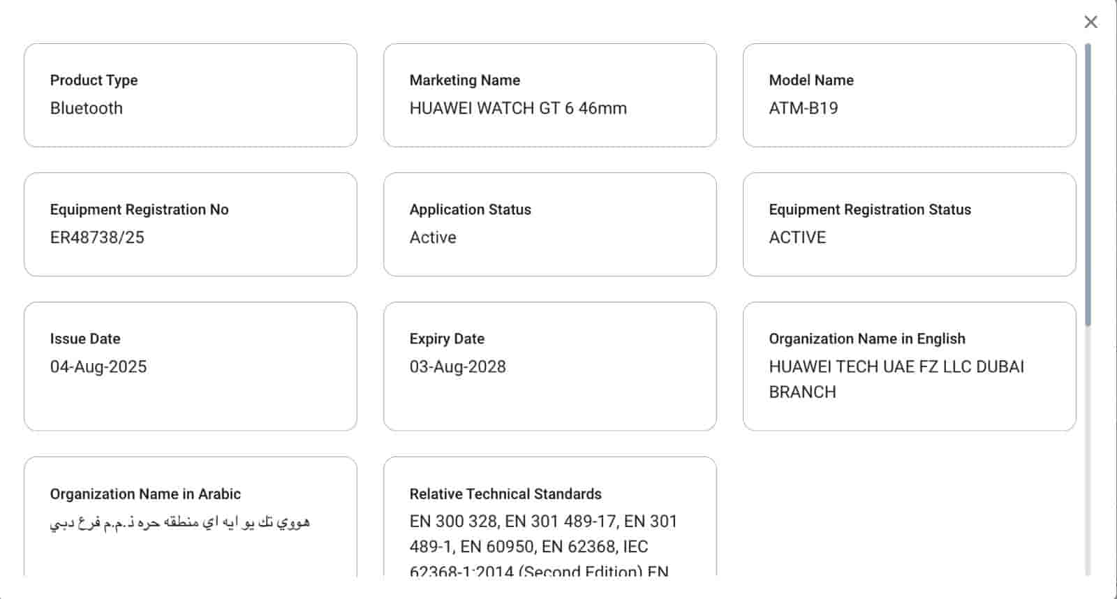 The 41mm and the 46mm size variants of the Huawei Watch GT 6 smartwatch that carries the respective model numbers of ‘KSU-B19’ and ‘ATM-B19’ have received the TDRA certification with the equipment registration numbers of ‘ER48739/25’ and ‘ER48738/25’, while the Huawei Watch GT 6 Pro 46mm smartwatch with the model number of ‘ATM-B29’ has been certified with the equipment registration number of ‘ER48740/25’. All the three are listed as Bluetooth products on the TDRA database, and their certification validity is till the 3rd of August 2028.