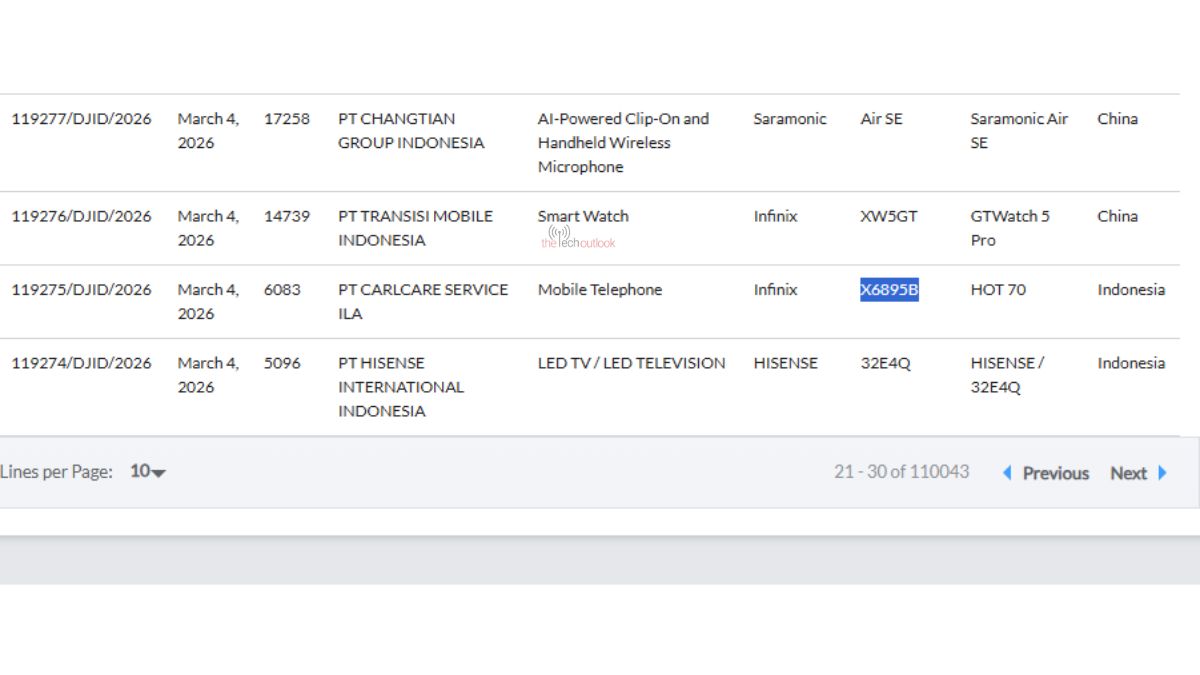 Starting with the Infinix Hot 70, the Indonesian SDPPI certification confirms the model number as “X6895B” and shows that it was given the approval on 4th March with the certificate number “119275/DJID/2026”. The next one is the TUV listing, which shows the same model number “X6895B”, along with another, but without the suffix “B”.