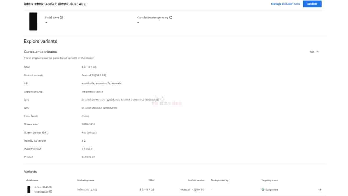 The Note 40s has been listed on the Google Play Console with the model number “X6850B”. Further examination of the listing reveals the chipset model number “MTK6789”, which corresponds to the Helio G99 SoC, though it could also be the G99 Ultimate.