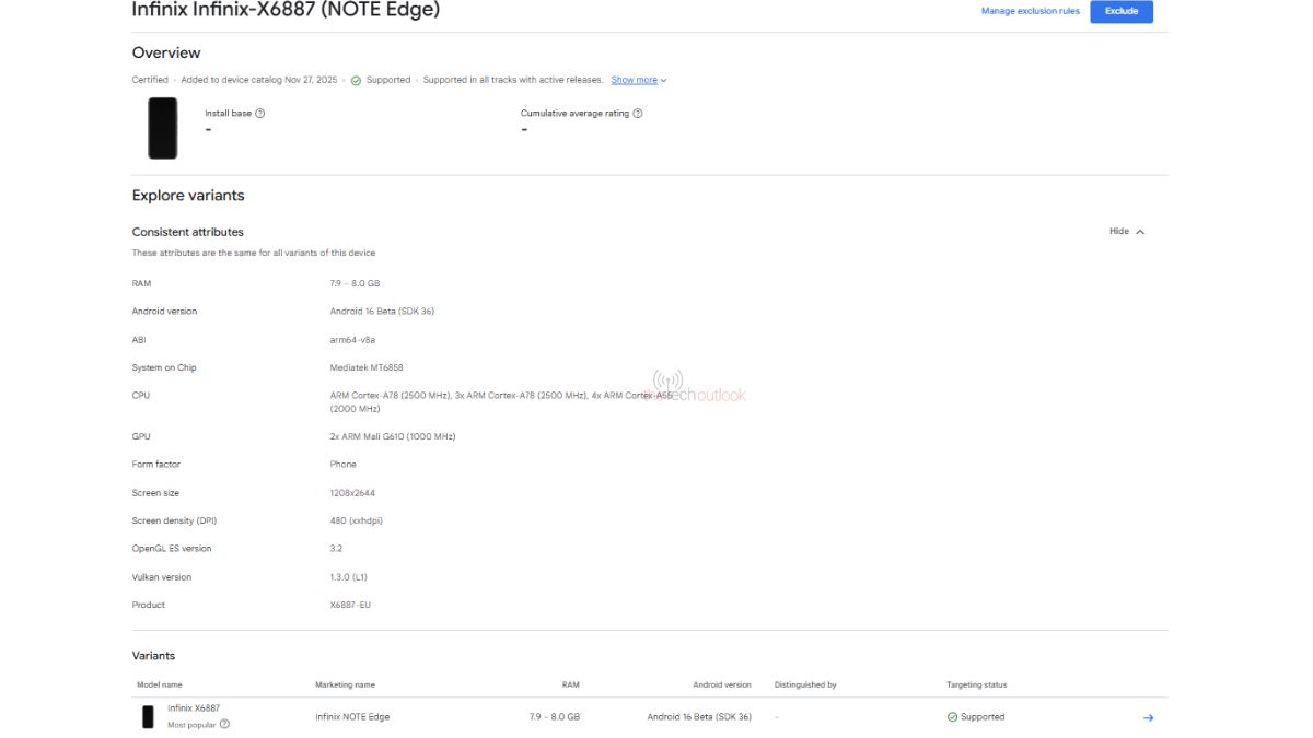The 8GB RAM variant of the Infinix Note Edge smartphone has been listed on the Google Play Console database, and it carries the model number of ‘X6887’. As per its listing, the device will come pre-installed with the Android 16 OS (the Google Play Console mentions ‘beta’), and it will be using a MediaTek chipset with the model number of ‘MT6858’. This appears to be a new chip, and is revealed with a core architecture consisting of a 2.50GHz-clocked ARM Cortex-A78 core, three 2.50GHz-clocked ARM Cortex-A78 cores, and four 2.00GHz-clocked ARM Cortex -A56 cores. It is also integrated with the ARM Mali G610 GPU (2x, 1.00MHz). About the display, it will support a screen resolution of 1208 x 2644 pixels and a pixel density of 480xxhdpi.