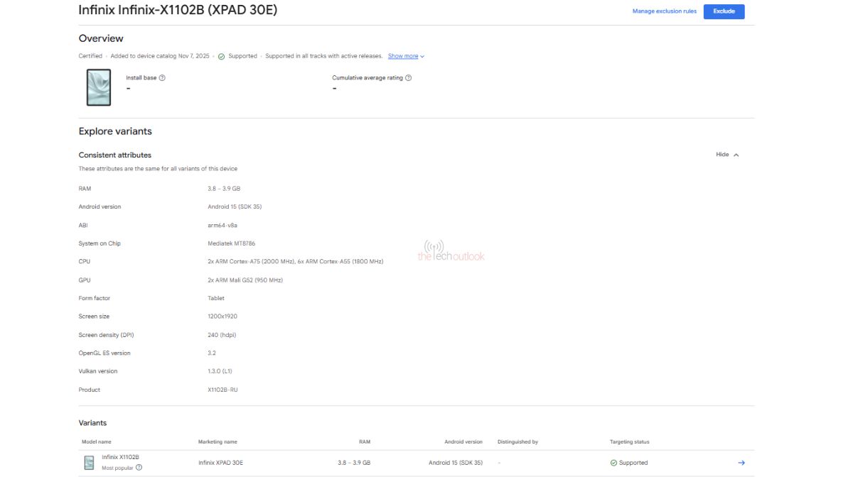 Speaking of the Infinix XPAD 30E, it has the model number of ‘X1102B’, and the 4GB RAM variant of this device has been listed on the Google Play Console database. It is revealed to run on the previous Android 15 OS, and is mentioned to use the MediaTek ‘MT8786’ chip with 2x 2.00GHz-clocked ARM Cortex-A75 cores + 6x 1.80GHz-clocked ARM Cortex-A55 cores and 2x ARM Mali G52 (950MHz) GPU. However, since this is a 2022-released chip and as modern day devices are powered by MediaTek’s Helio G-series chips, the upcoming Infinix XPAD 30E is also believed to use a MediaTek Helio G-series chipset. Also to add, a 1200 x 1920 pixels resolution display with 240hdpi pixel density has also been revealed for the device.