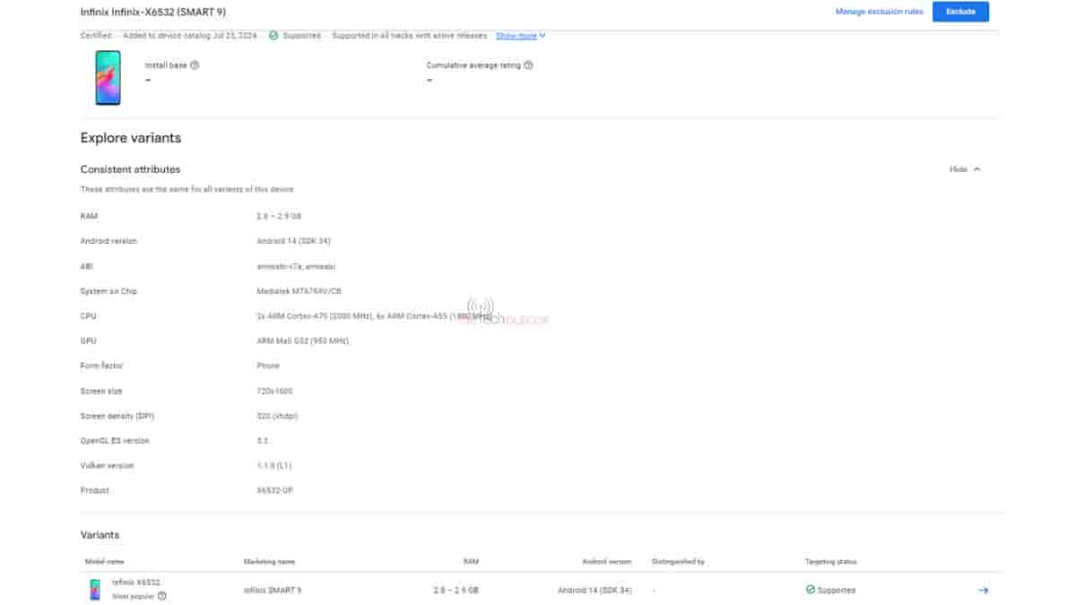 Infinix Smart 9 is listed with the model number “X6532” on both the Google Play Console and TUV certification. According to the Google Play Console listing, the device is powered by a MediaTek MT6769V/CB SoC paired with a Mali G52 GPU. The CPU cores are clocked with 2 cores at 2.0GHz and the other 6 at 1.8GHz. While the SoC codename corresponds to the MediaTek Helio G70, the clock speeds suggest it could be the MediaTek Helio G80.