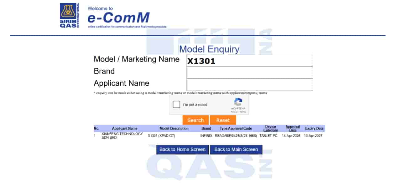 Infinix XPAD GT has now made its appearance on Malaysia’s SIRIM certification website with model number X1301 and type approval code REAQ/98F/0425/S(25-1668).