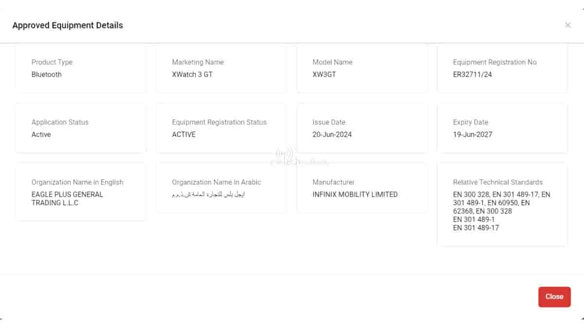 This upcoming smartwatch from Infinix has been registered on the UAE’s TDRA certification with the model number “XW3GT”. Thanks to this certification, the name has been revealed as Infinix XWatch 3 GT. It was approved on 20th June 2024 with the equipment registration number “ER32711/24”.