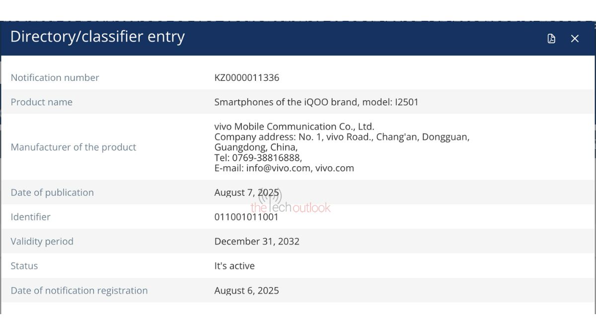 iQOO’s 15 flagship which carries the model number of ‘I2501’ has been listed on the SIRIM and EEC certification platforms and as mentioned, this is its global variant. On the SIRIM database, the device has received the certification with the type approval code of ‘RGQL/72J/1025/S(25-5119)’, and it has been categorized as a ‘mobile phone’. To note, its SIRIM certification validity is till the 2nd of October 2026. Coming to its EEC certification, the device has been certified with the notification number of ‘KZ0000011336’, and its EEC certification will be valid only till the 31st of December 2032. Also to add, its launch in both the Malaysian and European markets has been confirmed via these certifications.