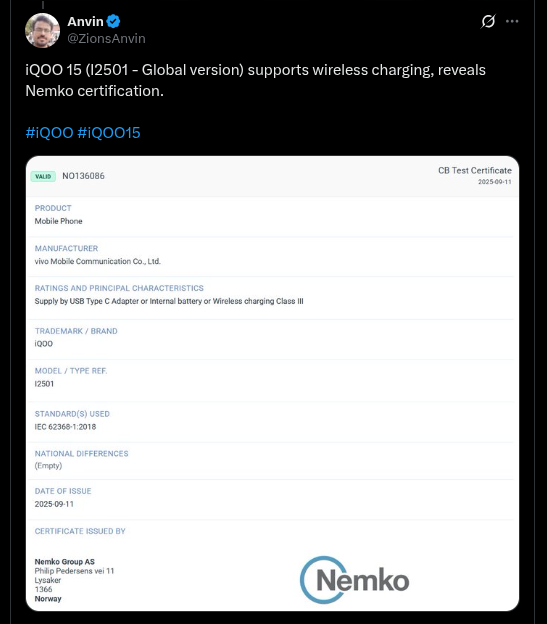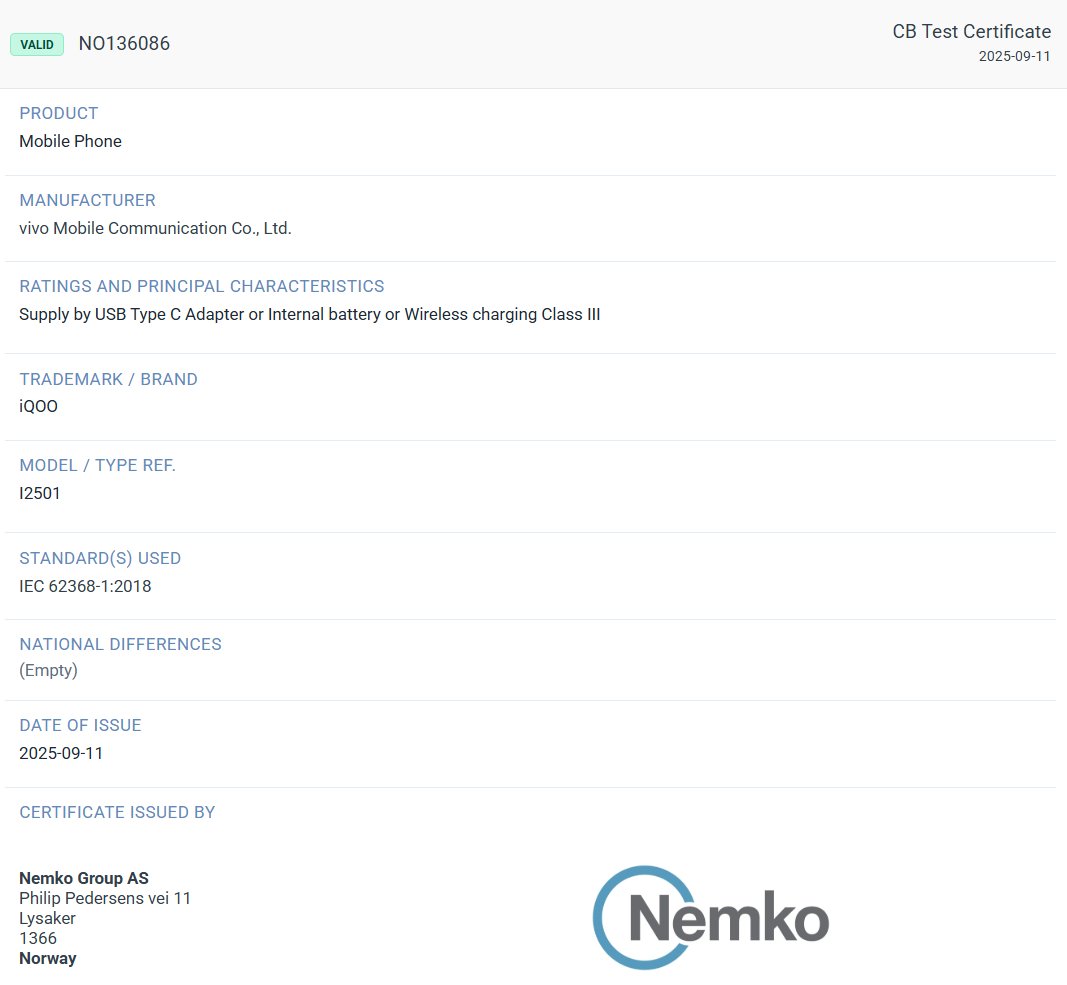 Coming to the Nemko certification, the global variant of the iQOO 15 smartphone that carries the model number of ‘I2501’ has received the certification. It has been certified with the certificate number of ‘NO136086’, and it is categorized as a ‘Mobile Phone’ on the certification platform. Notably, unlike its predecessor, the upcoming iQOO 15 device is revealed to support a wireless charging capability. Additionally, it will also offer Class III protection (~ meaning it features a protective design and supports low voltage operation).