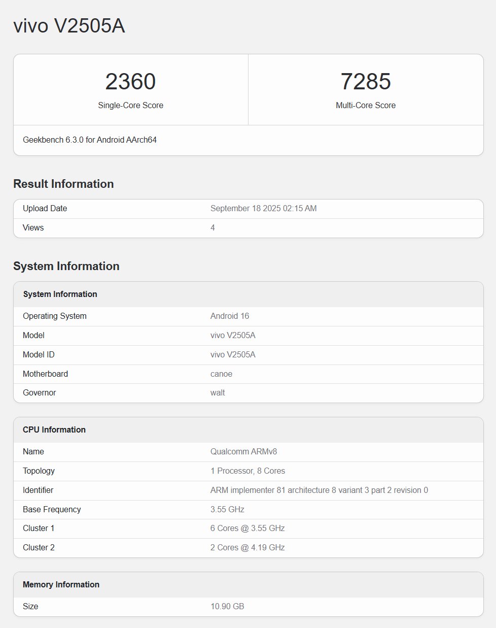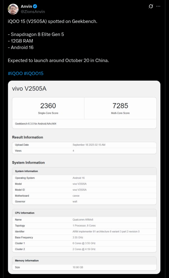 The iQOO 15 smartphone model with the model number of ‘V2505A’ has been listed on the Geekbench database, and this is its Chinese variant. It has acquired 2360 points and 7285 points respectively in the single-core and multi-core tests, and specs such as the Qualcomm Snapdragon 8 Elite Gen 5 chipset (clocked at 4.19GHz), Android 16 OS, and 12GB RAM option have been revealed for the device.