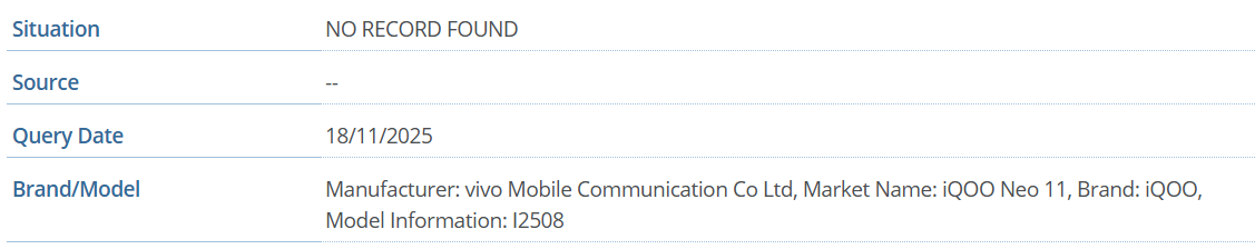The iQOO Neo 11 device has made its appearance on the IMEI database with model number I2508. The database reveals the moniker and model number of the device.
