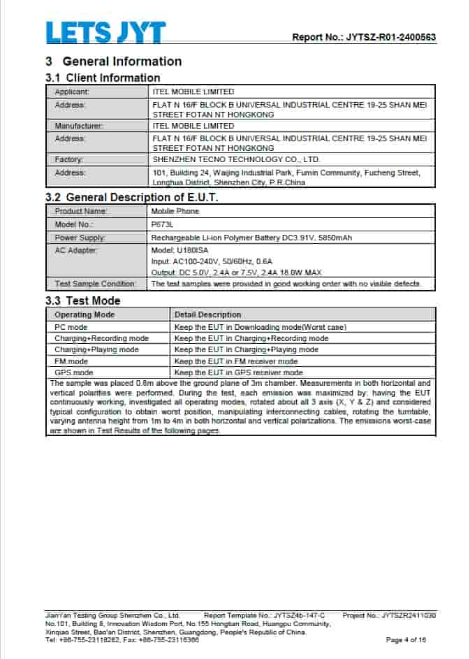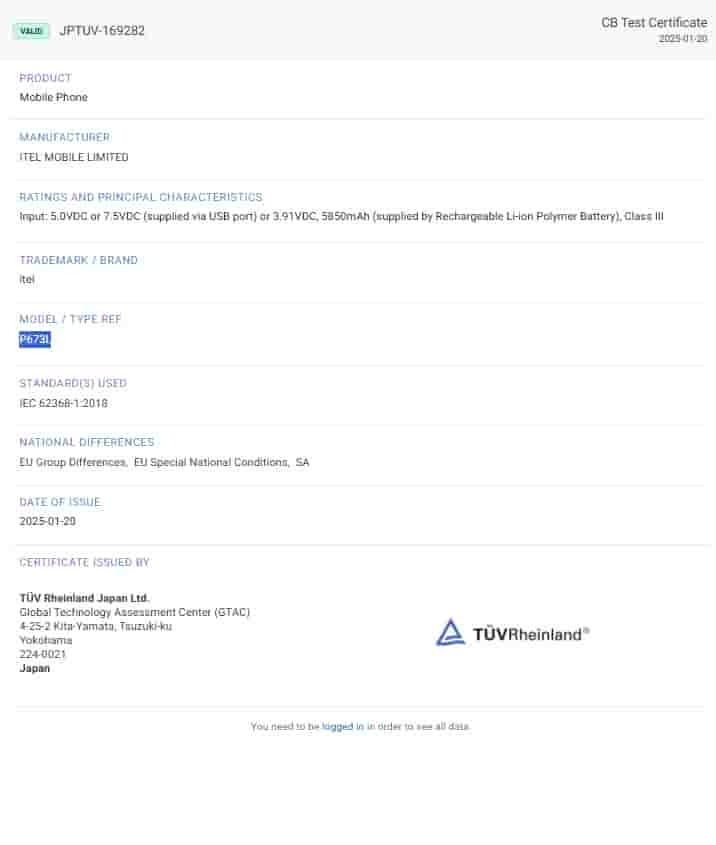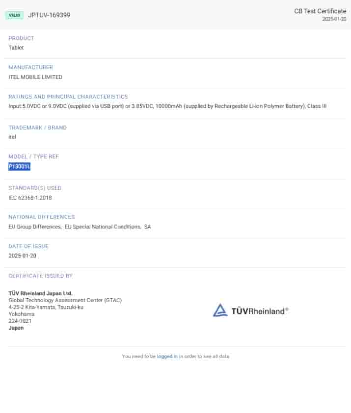 As mentioned, the itel P70 smartphone with the model number – ‘P673L’ and itel’s new tablet with model number – ‘P13001L’ have made it to the TUV Rheinland certification database, and they have been certified with the respective certificate numbers of ‘JPTUV-169282’ and ‘JPTUV-169399’. These two devices are also pointed out to pack 5850 mAh (Li-ion polymer) and 10000 mAh (Li-ion polymer) batteries, and support 5.0/7.5/3.91 VDC and 5.0/9.0/3.85 VDC charging, respectively.