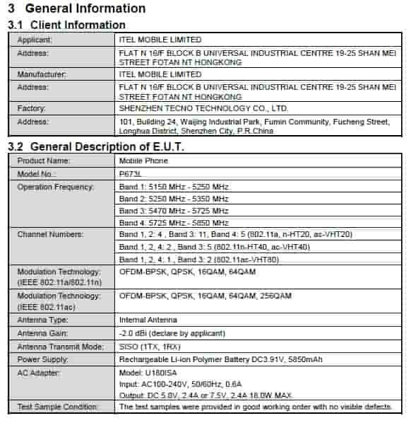 The itel P70 smartphone with the same model number of ‘P673L’ has also received the FCC certification, and in addition to the battery capacity, the FCC database reveals that the smartphone has a charging adapter with model number – ‘U180ISA’, confirming that it will support 18W wired fast charging. Also, it will support Wi-Fi 5 possibly with dual band support.