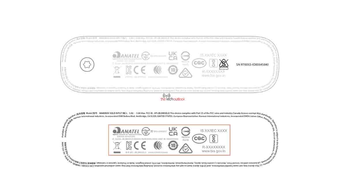 Also to add, the live image of the speaker’s internal components have revealed that it will be supporting a Bluetooth firmware version of ‘0.5’. This suggests key specs like Bluetooth 5.1 profile, improved stereo setup stability (using JBL Portable app), improved Mac computers compatibility, and enhanced music light show synchronization for JBL’s BandBox Solo portable Bluetooth speaker. To note, the label of the speaker also mentions that this device follows both China’s CQC and India’s BIS certification standards too.
