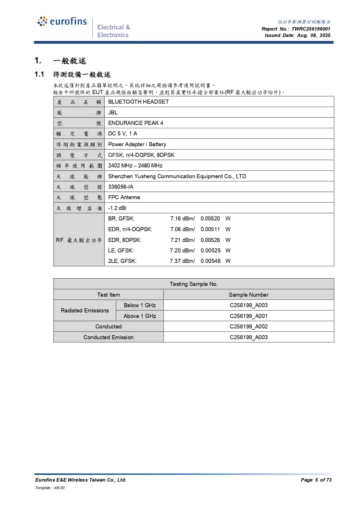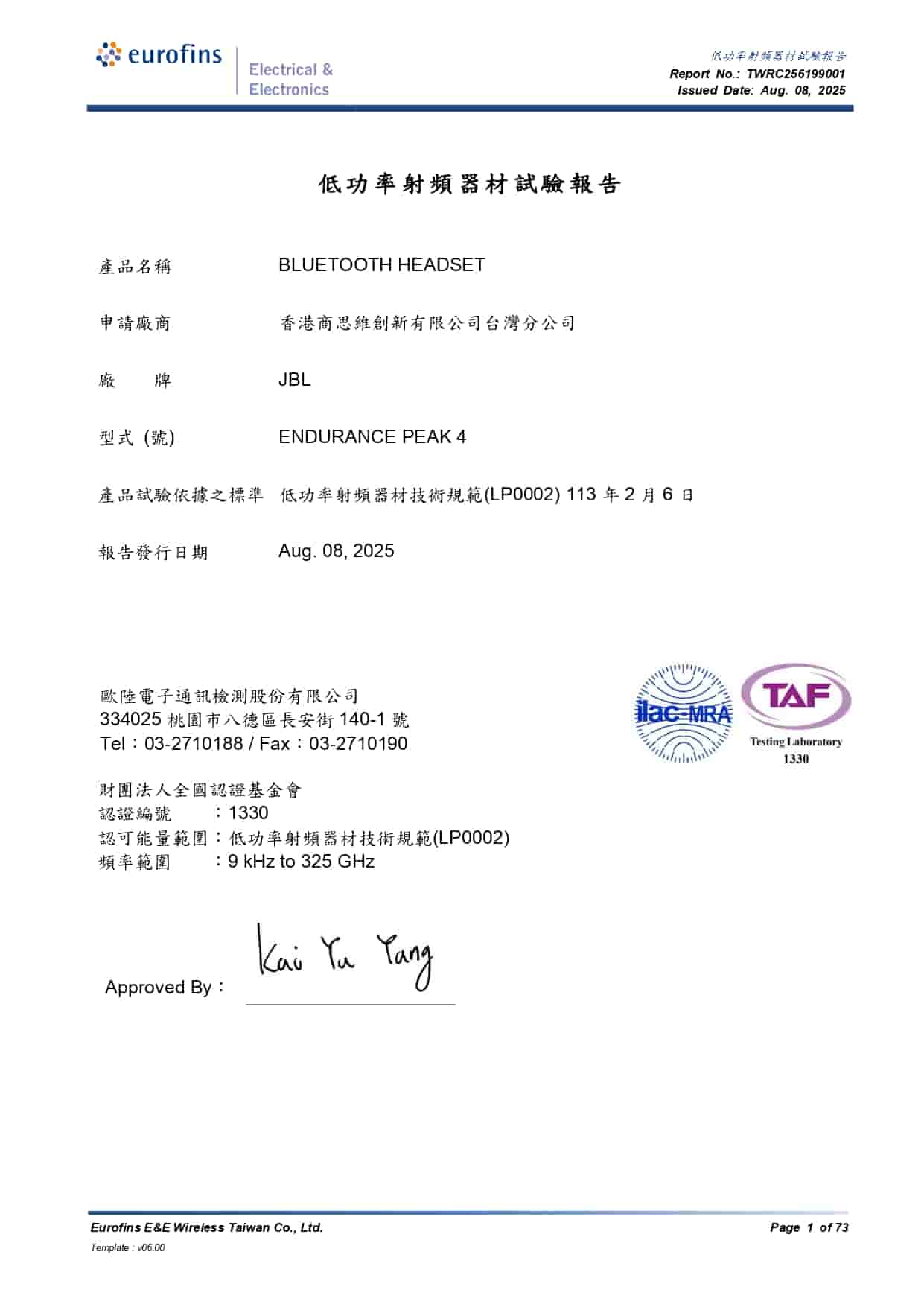 The JBL Endurance Peak 4 earbuds device has been listed on the NCC certification database as a ‘Bluetooth Headset’, and it has received the certification with National Foundation Certificate Number of ‘1330’. Additionally, the device has been qualified as a low power radio frequency equipment with ‘LP0002’ technical specification and ‘9kHz ~ 325GHz’ frequency range.