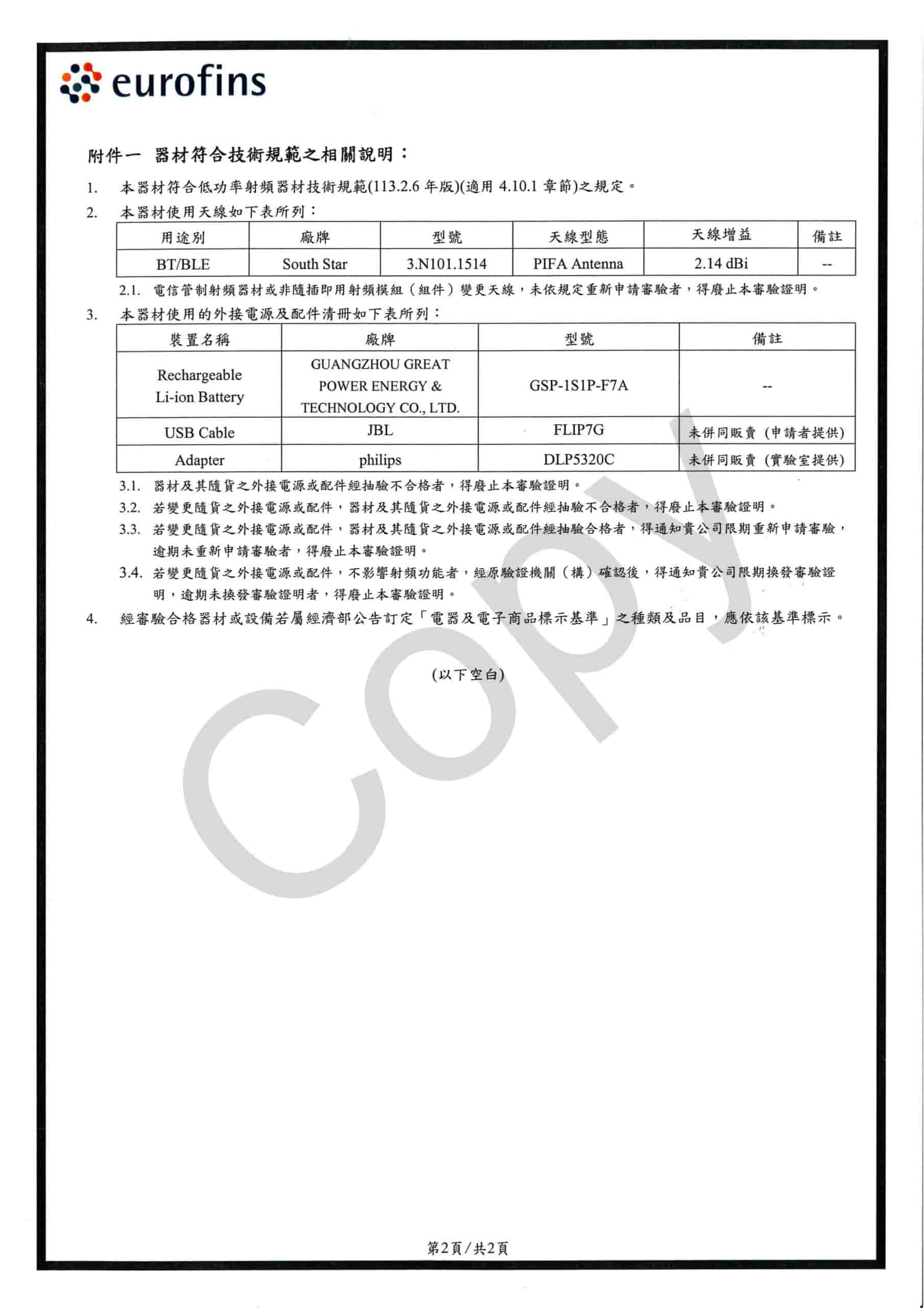 The BT/BLE antenna used is the South Star 3.N101.1514 model (PIFA) with 2.14 dBi antenna gain. It equips a rechargeable Li-ion battery with model number – ‘GSP-1S1P-F7A’, and is listed with a Philips adapter with model number – ‘DLP5320C’ and JBL ‘FLIP7G’ data cable.
