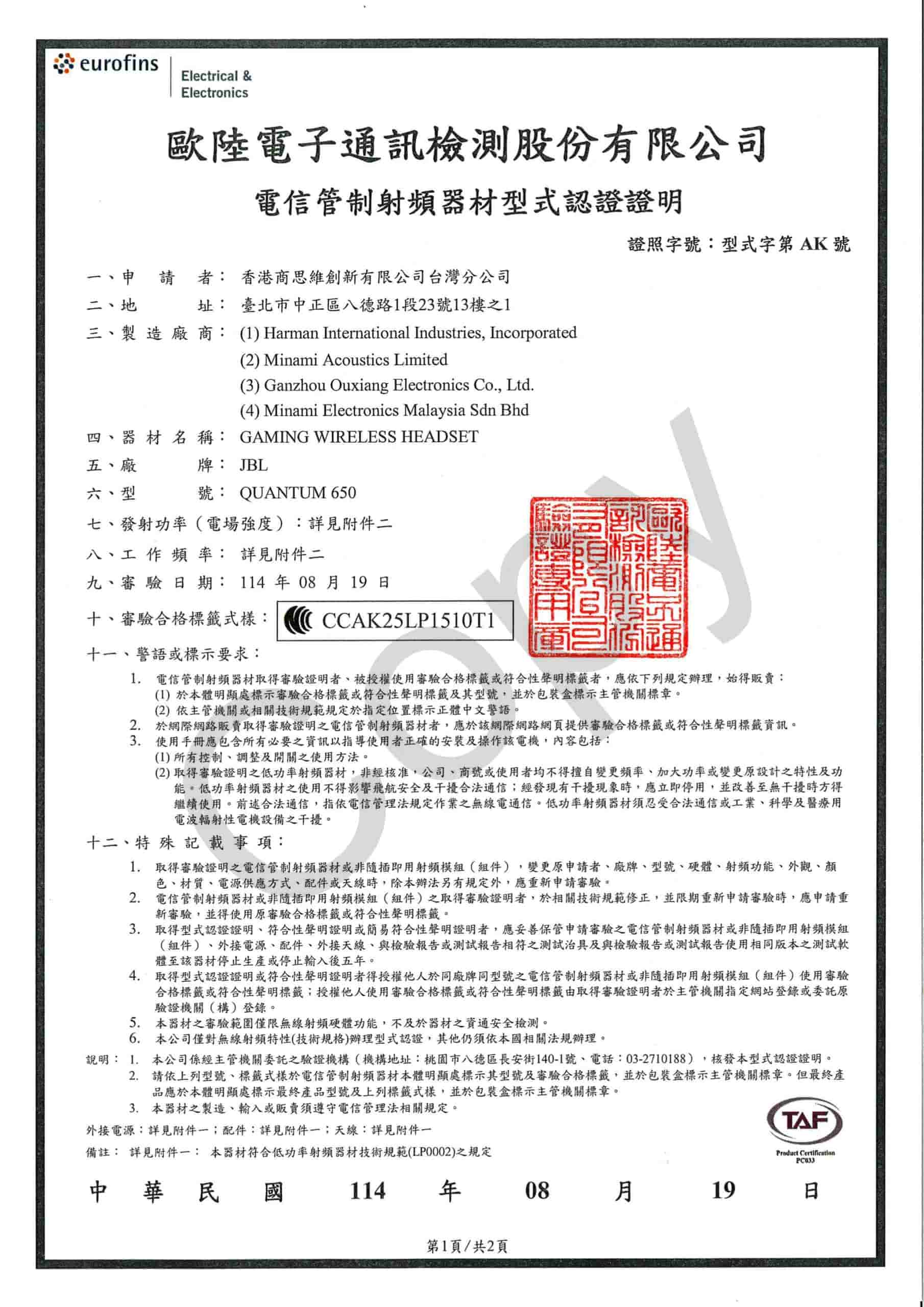 JBL Quantum 650 Gaming Wireless Headset – NCC Certification