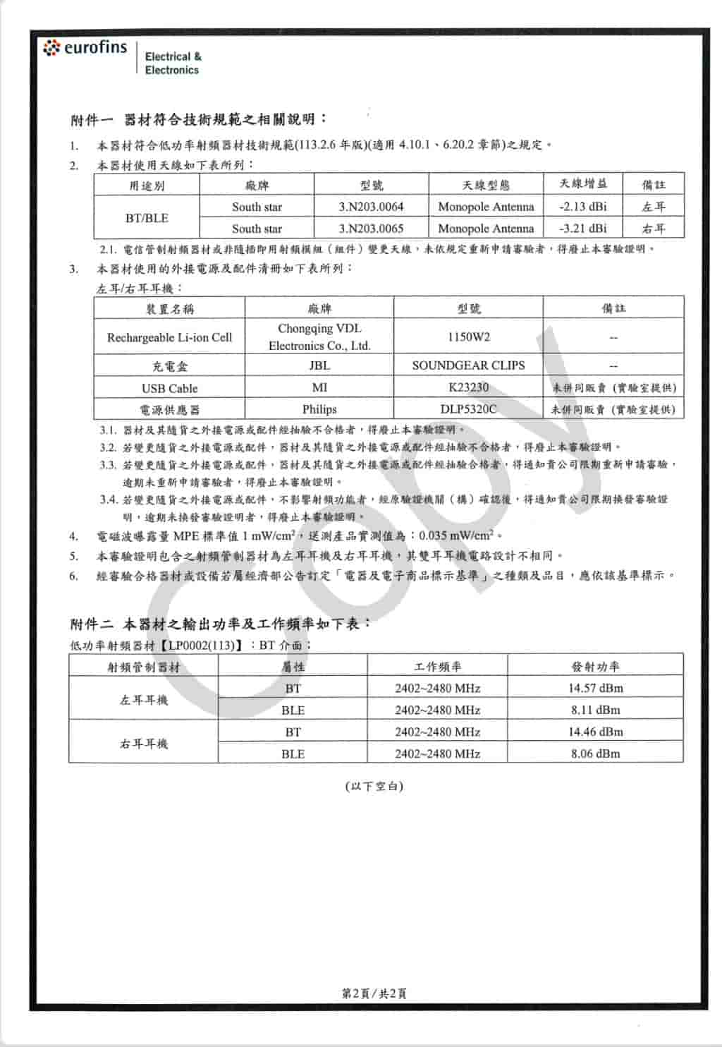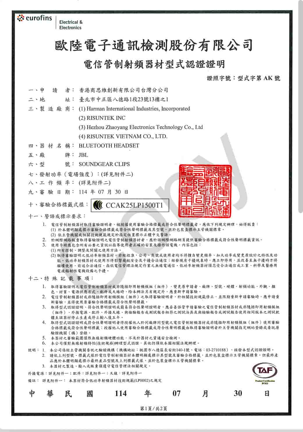 The JBL SoundGear Clip has received the NCC certification with the inspection and approval label number of ‘CCAK25LP1500T1’. Notably, the listing reveals that the JBL Li-ion battery with the model number of ‘1150W2’ will be equipped within the device, and the earbuds will be supporting an operational frequency ranging between 2402~2480 MHz.