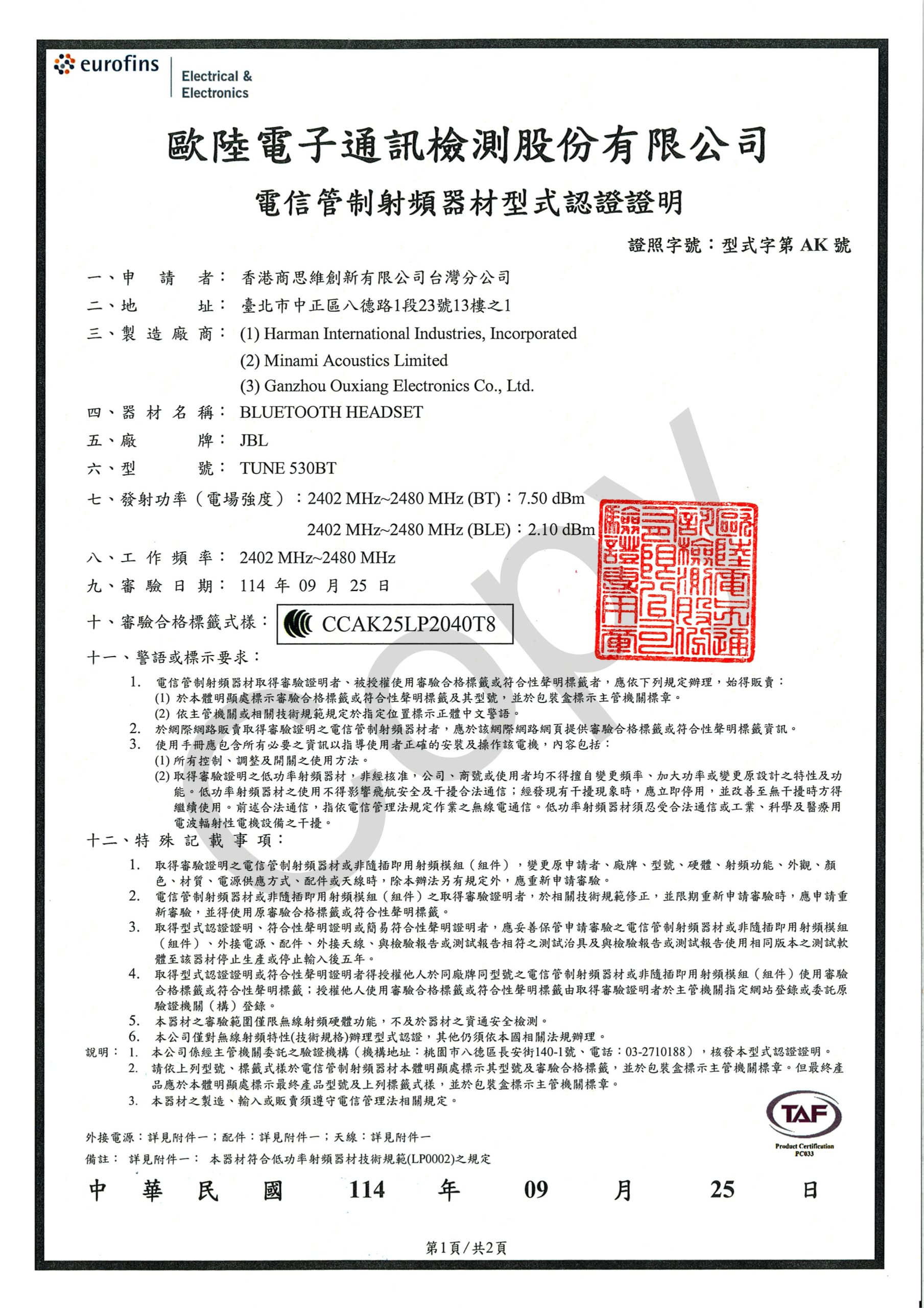 JBL TUNE 530BT – NCC Certification