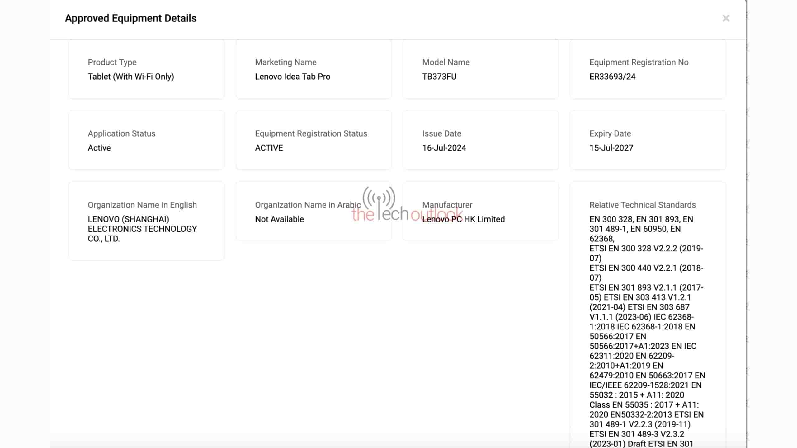 Lenovo Idea Tab Pro with model number “TB373FU” spotted on UAE’s TDRA along with UL Demko certification