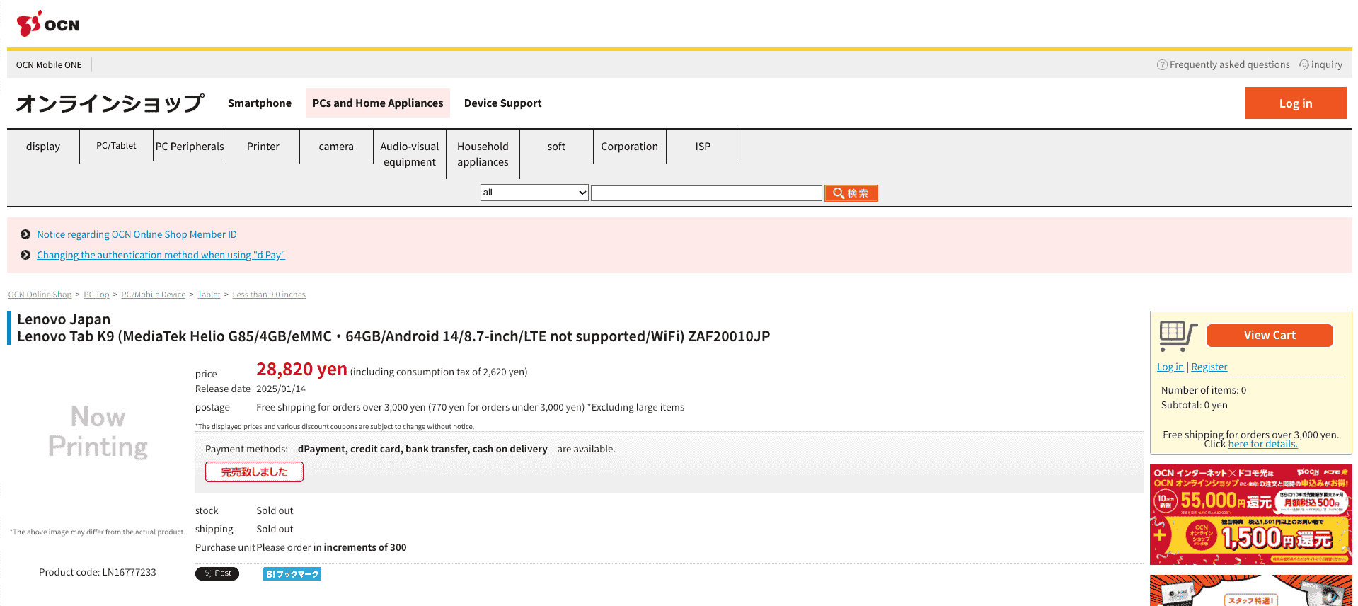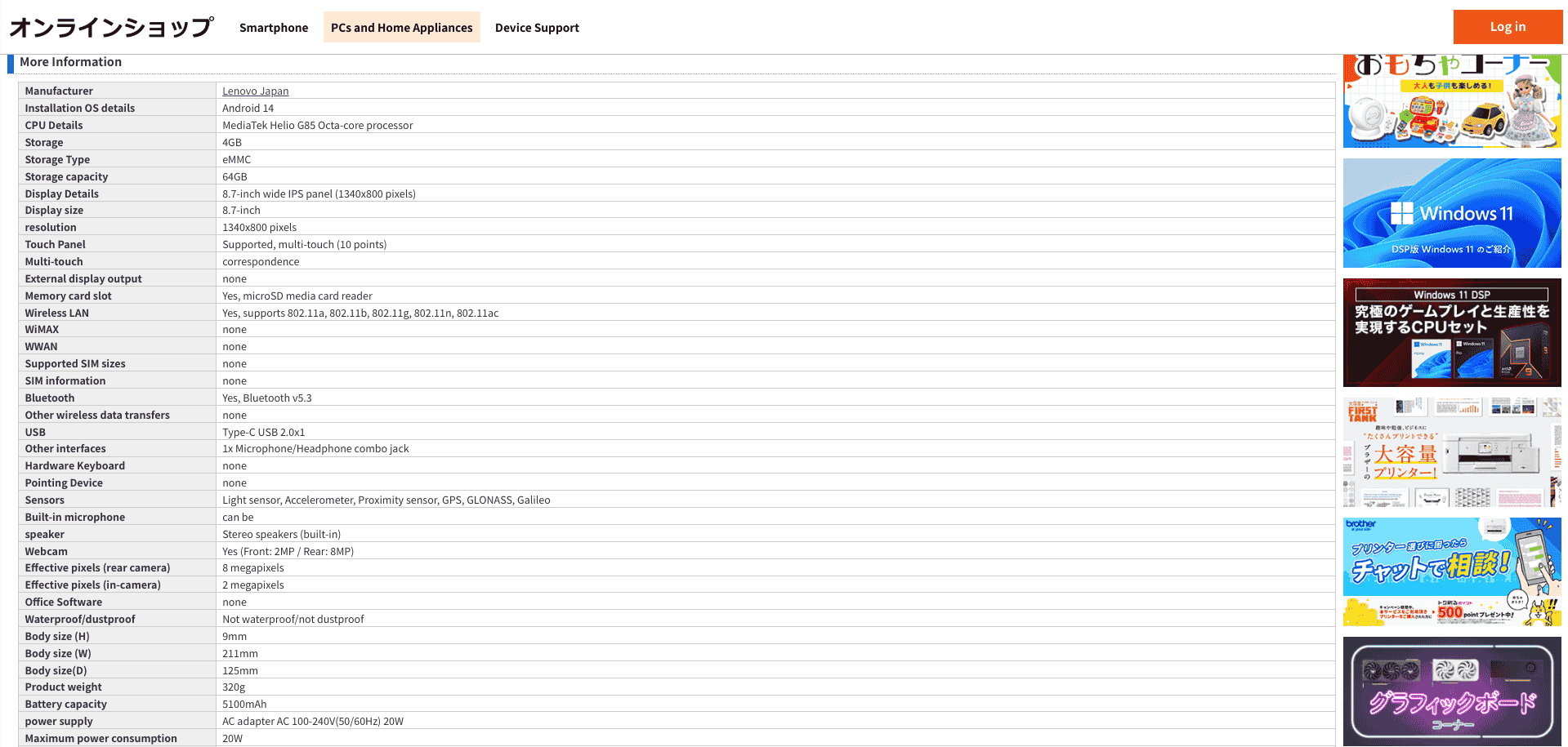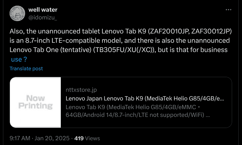 On the OCN website (~ Open Computer Network, a major Japanese internet service provider), this device has been listed as ‘Lenovo Tab K9’ with the model number – ‘ZAF20010JP’, and it has been priced at JPY 28,820. Few of its key specs that have been revealed via the website include the MediaTek Helio G85 octa-core processor, Android 14 operating system, 4GB RAM, 64GB internal storage (eMMC), microSD card slot, 8.7″ IPS wide display screen with 1340 x 800 pixels resolution and 10 points multi-touch, 8MP rear camera, 2MP selfie camera, 5100 mAh battery, 20W wired charging, WiFi 5, Bluetooth 5.3, USB Type-C 2.0, microphone x headphone jack, multiple sensors (light sensor, accelerometer, proximity sensor, GPS, GLONASS, & Galileo), inbuilt stereo speakers and microphone (‘can be’ as per listing), 211 x 125 x 9 mm dimension, and 320 gm weight.