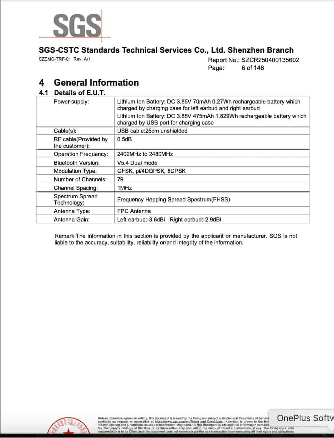 The left and right earbuds are revealed to be powered by a 70mAh battery, while the charging case is revealed to be powered by a 475mAh battery. The charging case includes a USB port, while there will be a 25cm USB cable to charge the case. It comes with 2402MHz to 2480MHz operation frequency. The earbud will support Bluetooth 5.4 dual-mode connectivity. It comes with an FPC antenna and Frequency Hopping Spread Spectrum. Left earbud comes with -3.6dBi antenna gain, and right earbud comes with -2.9dBi antenna gain.