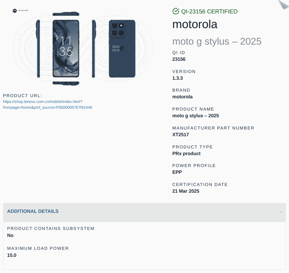 On the WPC database, the Moto G Stylus 2025 smartphone carrying the model number of ‘XT2517’ has appeared, and the moniker of the device has been listed along with a few of its renders. It has received the certification with the QI ID – ‘23156’ and it will support a Qi version of ‘1.3.3’, with a wireless fast charging feature of up to 15W.