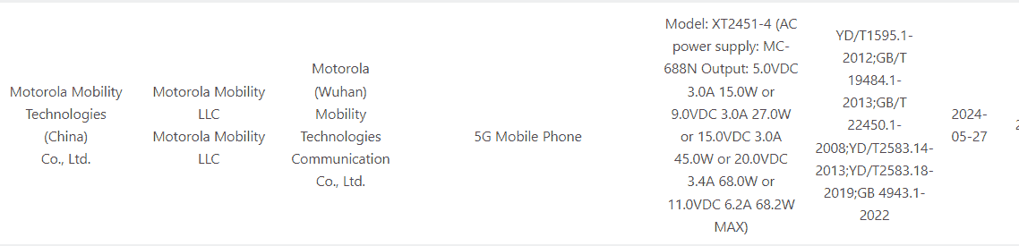 A few days back we saw the Moto Razr 50 design and specs being revealed after its listing on the TENAA certification website. This listing brought out a significant thing which is the confirmation of the cover display. Now the ultra version or Moto Razr 50 Ultra has been spotted on China’s 3C certification by an X user named Anvin. This smartphone has appeared with the model number XT2451-4 and confirms that it will support up to 68W fast charging. The Moto Razr 40 Ultra smartphone comes with 30W TurboPower charging support so obviously a major improvement. A few days ago the Moto Razr 50 was also found listed on China’s 3C certification website confirming that it will support up to 33W fast charging. This means the Razr 50 will have no change in the fast charging capabilities as compared to the Razr 40 from last year.