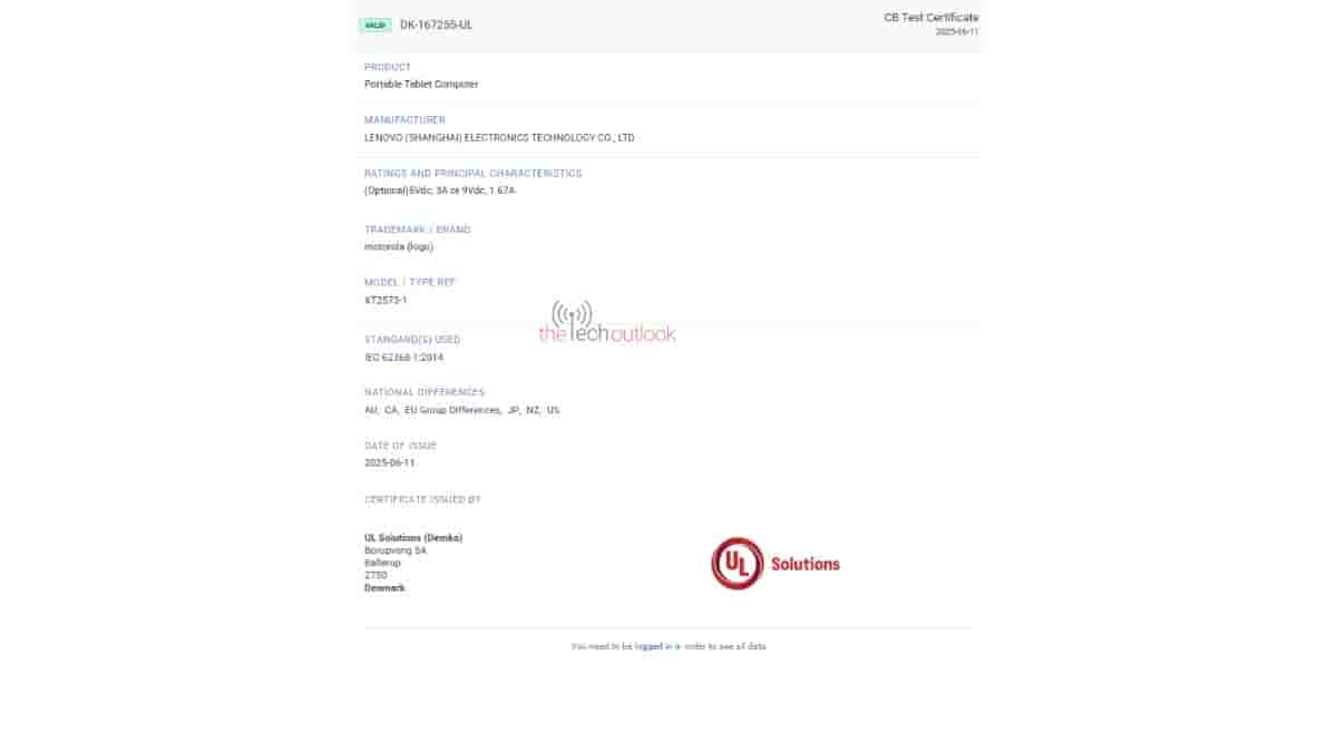 Coming to its UL Demko listing, the Moto Pad 60 Lite tablet of Motorola with the same model number of ‘XT2573-1’ has received the UL Demko certification with the certificate number of ‘DK-167255-UL’, and it is again listed as a ‘portable tablet computer’. As per the UL Demko database, this upcoming device is revealed to support a 15W wired fast charging feature. Moreover, the countries codes (AU, CA, EU, JP, NZ, and US) mentioned on the database points to its expected launch in Australia, Canada, Europe (particularly in Denmark), Japan, New Zealand, and in the United States.