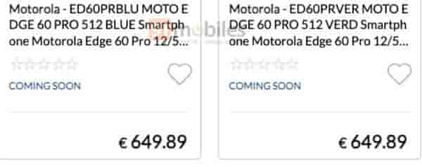 Motorola Edge 60 Pro is said to be available in Blue and Green colors. The device will offer 12GB RAM and a 512GB storage option listed at EUR 649.89, which again is slightly more than the previously revealed EUR 600 pricing.