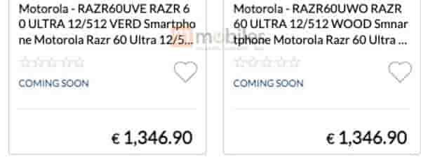 Coming to the Motorola Razr 60 Ultra, it is said to arrive in Mountain Trail Wood and Scarah Green (Verde) colors. It is listed for EUR 1346.90 for the 12/512GB model.