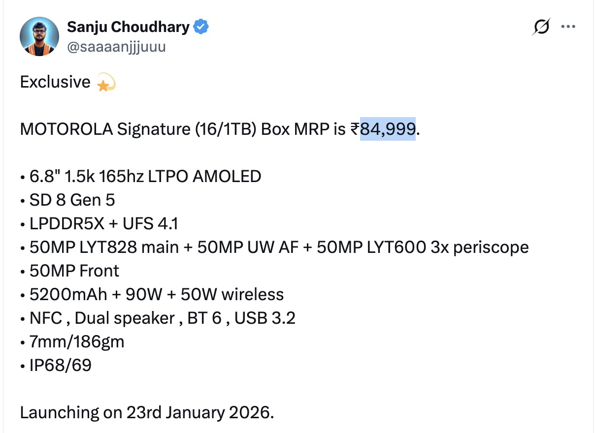 The latest information comes from tipster Sanju Choudhary, who claims that the 16GB RAM + 1TB storage variant of the Motorola Signature will carry a boxed MRP of ₹84,999. As usual, the boxed MRP is expected to be higher than the actual retail selling price.