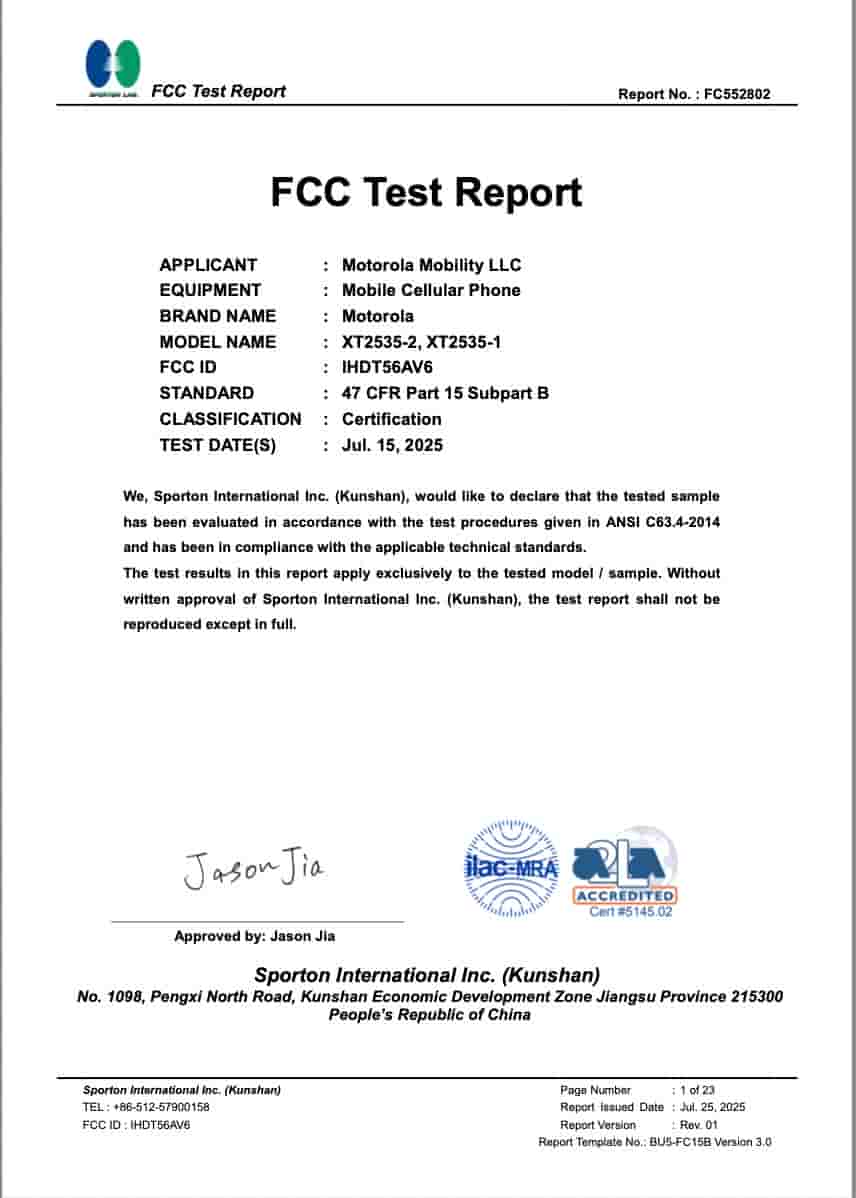 Motorola Smartphone (XT2535-2, XT2535-1) – FCC Certification