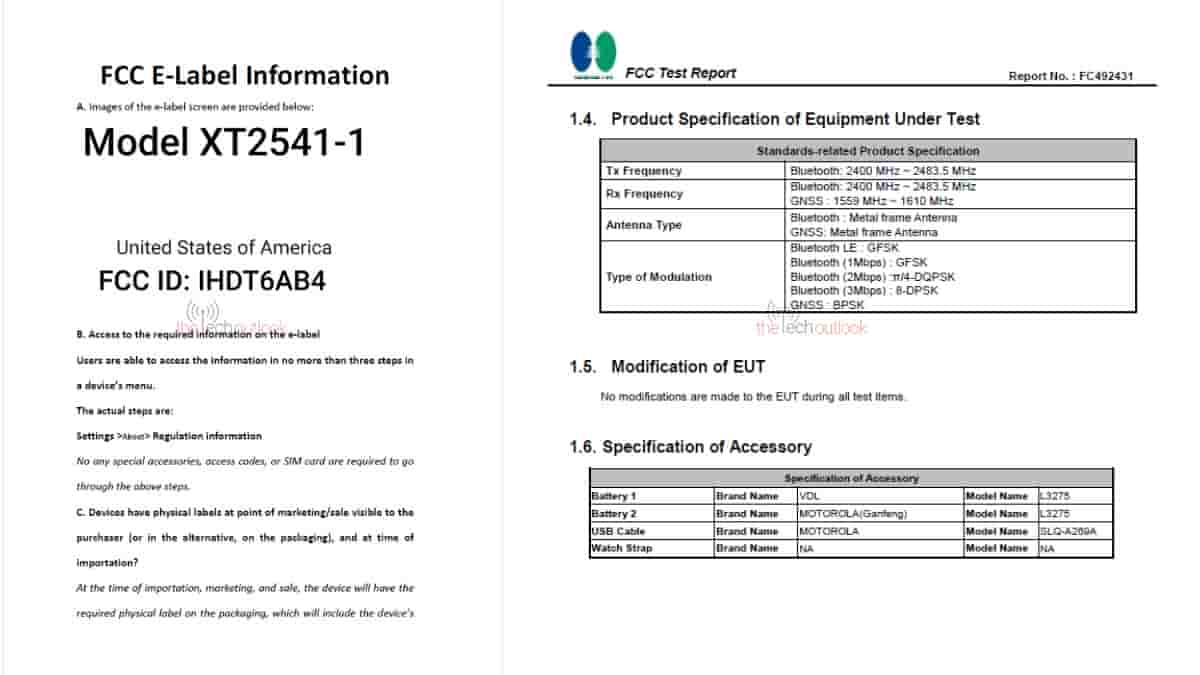 The upcoming Motorola smartwatch which bears the model number – ‘XT2541-1’ has received the FCC certification with the FCC ID of ‘IHDT6AB4’. As per the FCC listing, this device is revealed to have a Bluetooth frequency (Tx & Rx) of 2400 MHz ~ 2483.5 MHz, GNSS frequency (Rx) of 1559 MHz ~ 1610 MHz, along with metal frame antennas for Bluetooth and GNSS. To note, the metal frame antenna type indicates that the watch makes use of the metal chassis or the frame as part of its antenna system. The type of modulation for Bluetooth LE is GFSK, Bluetooth 1 Mbps is also GFSK, Bluetooth 2Mbps is π/4-DQPSK, Bluetooth 3 Mbps is 8-DPSK, and GNSS is BPSK.