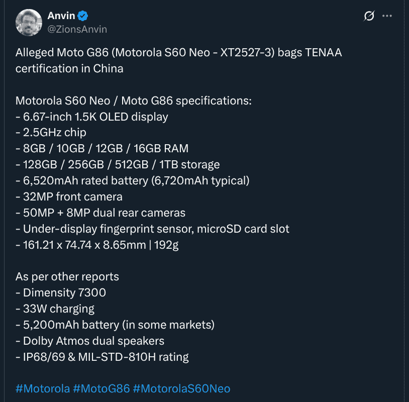 Alleged S60 Neo/Moto G86 – TENAA Certification and Revealed Specs