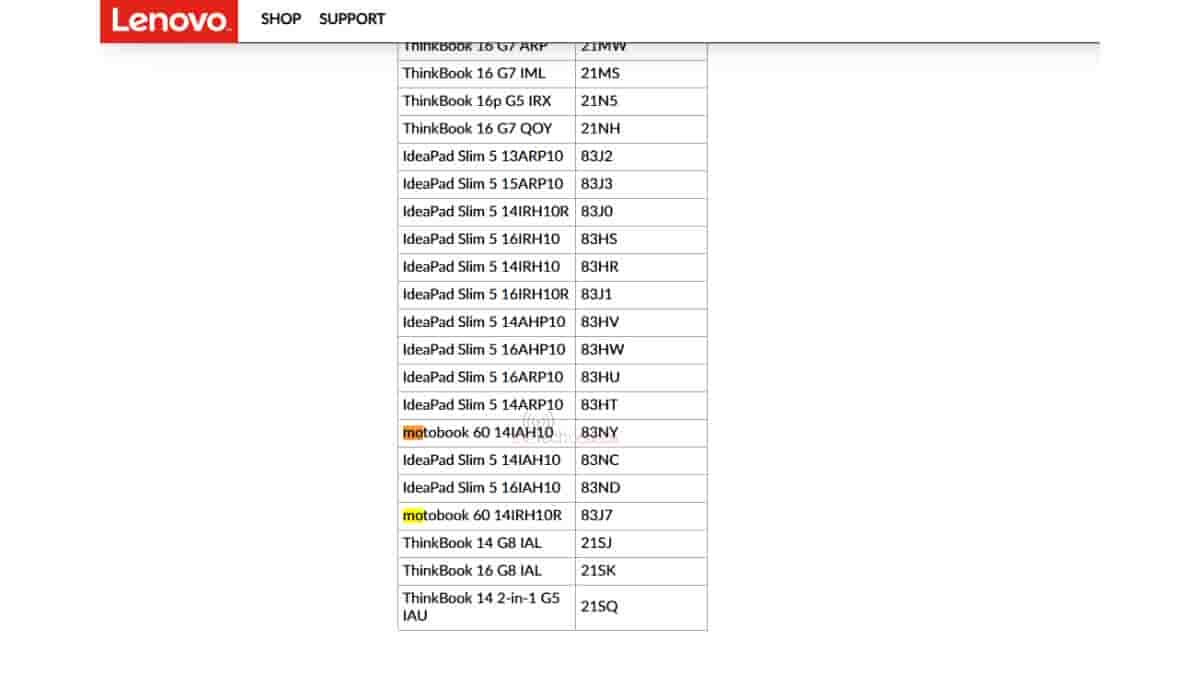 Coming to the Lenovo Support List, the Motorola’s Motobook 60 is listed on the database with two model numbers – ’14IAH10′ (code number – ’83NY’) and ’14IRH10R’ (code number – ’83J7′). Do note that the Motobook 60 model numbers are same/similar when compared to that of the Lenovo-branded IdeaPad Slim 5, suggesting that the upcoming Motobook 60 could be hitting the market as a re-branded version of this Lenovo laptop. Also, the device is likely to be made available with a 14″ display screen size.