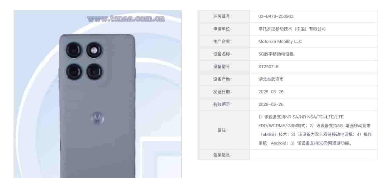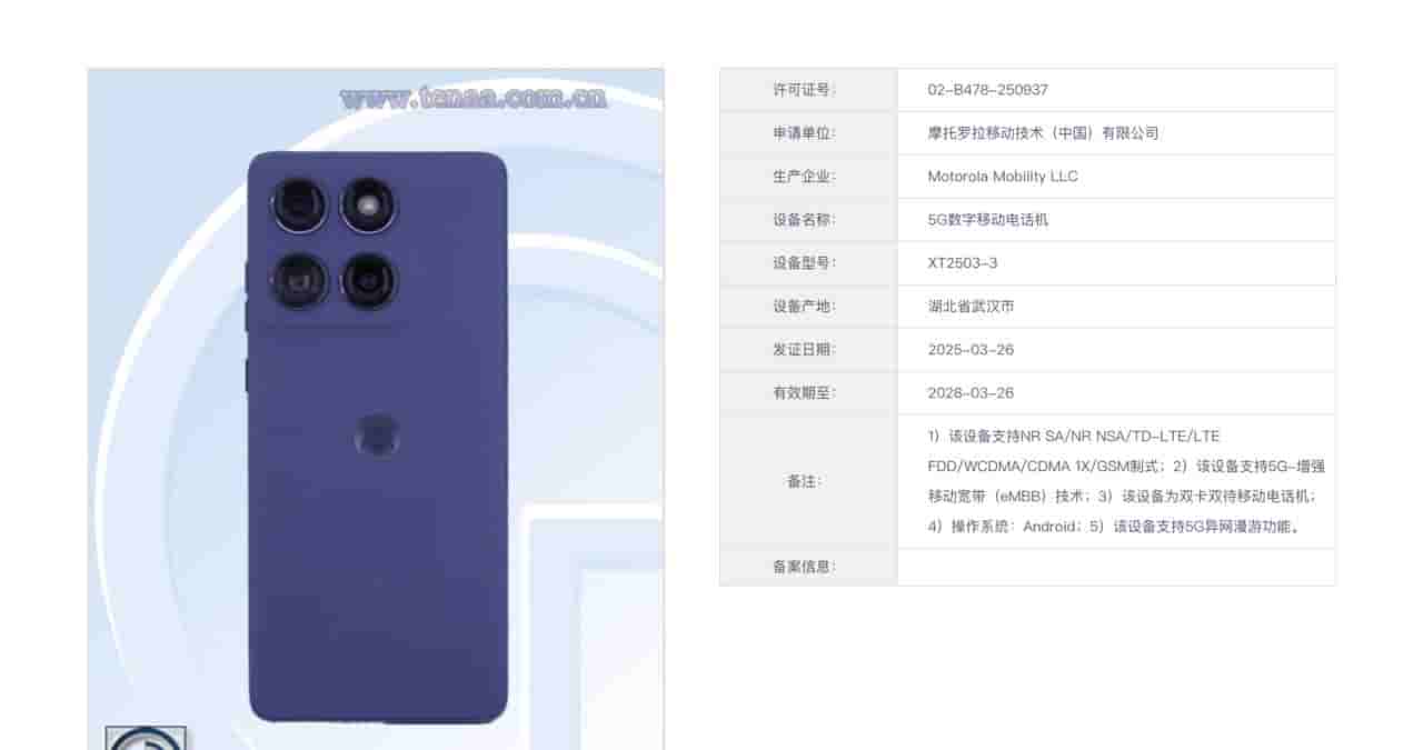 The Motorola ‘XT2503-3′ has received the TENAA and MIIT certifications with the certificate number – ’02-B478-250937’, and the device is revealed to be a 5G digital mobile phone.