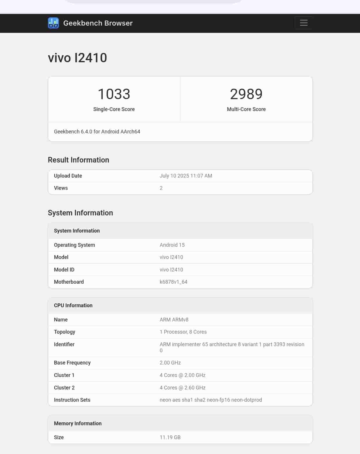 New iQOO Z10 Series Smartphone (‘I2410’) Appears on the Geekbench and BIS Databases: Dimensity 7400/7400X Chip, Android 15 OS, and 12GB RAM Revealed