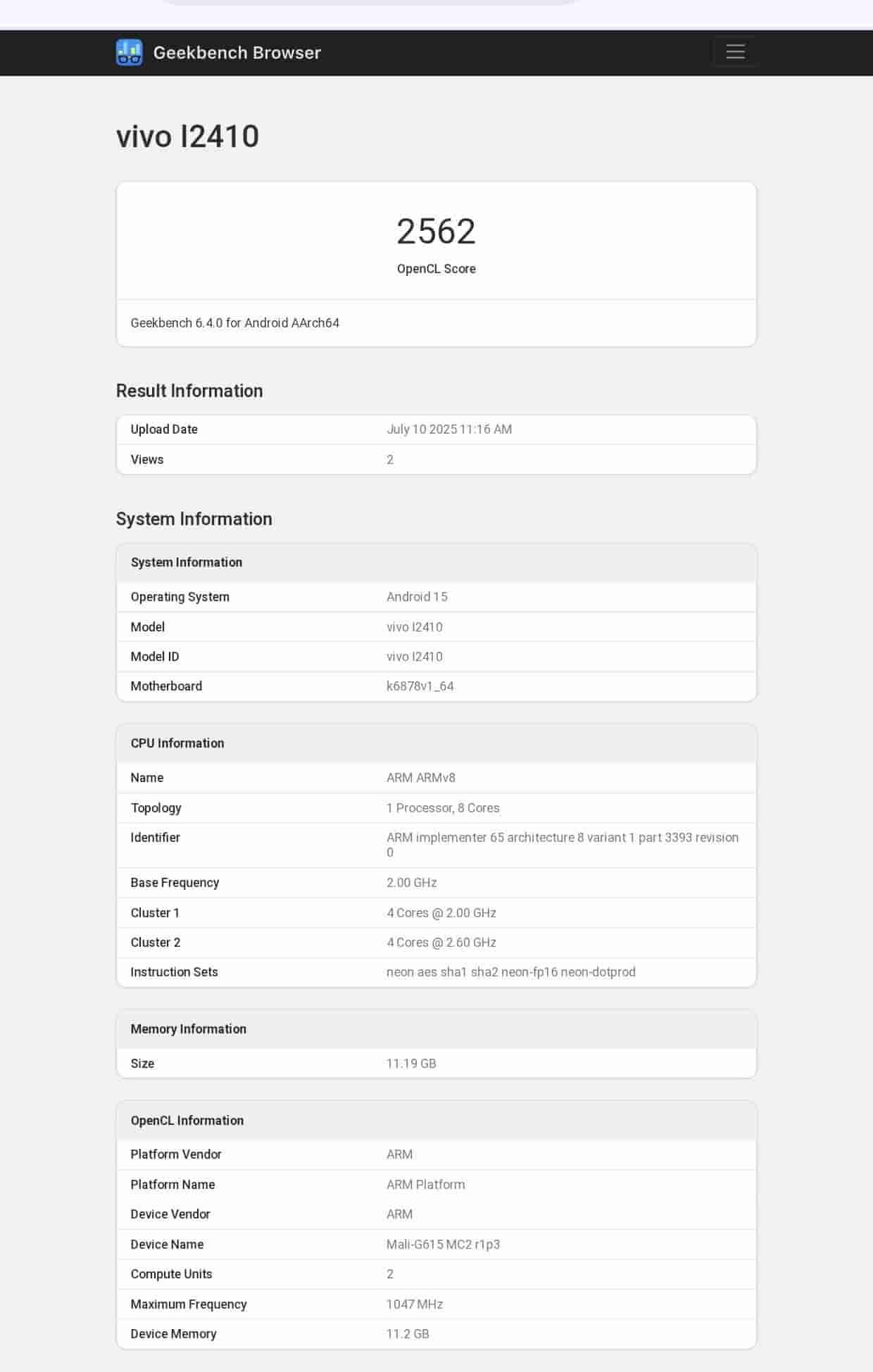 On the Geekbench database, this iQOO Z10 series smartphone with the model number of ‘I2410’ has attained 1033 points on the single-core test and 2989 points on the multi-core test. The device was also able to achieve an OpenCL score of 2562 points too. It is the 12GB RAM variant of the device that has been listed on the Geekbench database, and a few other performance related specs such as the MediaTek Dimensity 7400/7400X chipset that is integrated with the ARM Mali-G615 MC2 r1p3 GPU, and also the Android 15 operating system have been revealed for the device.