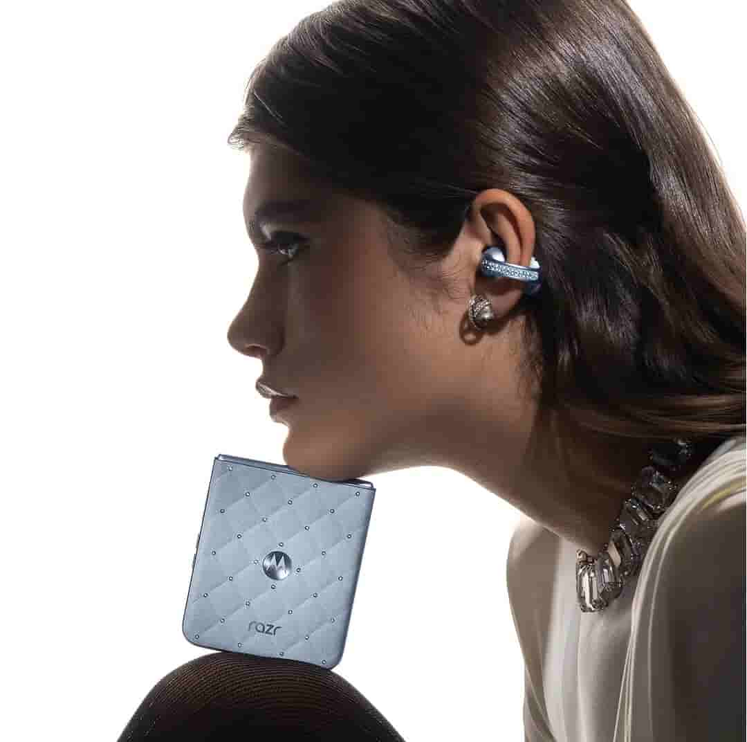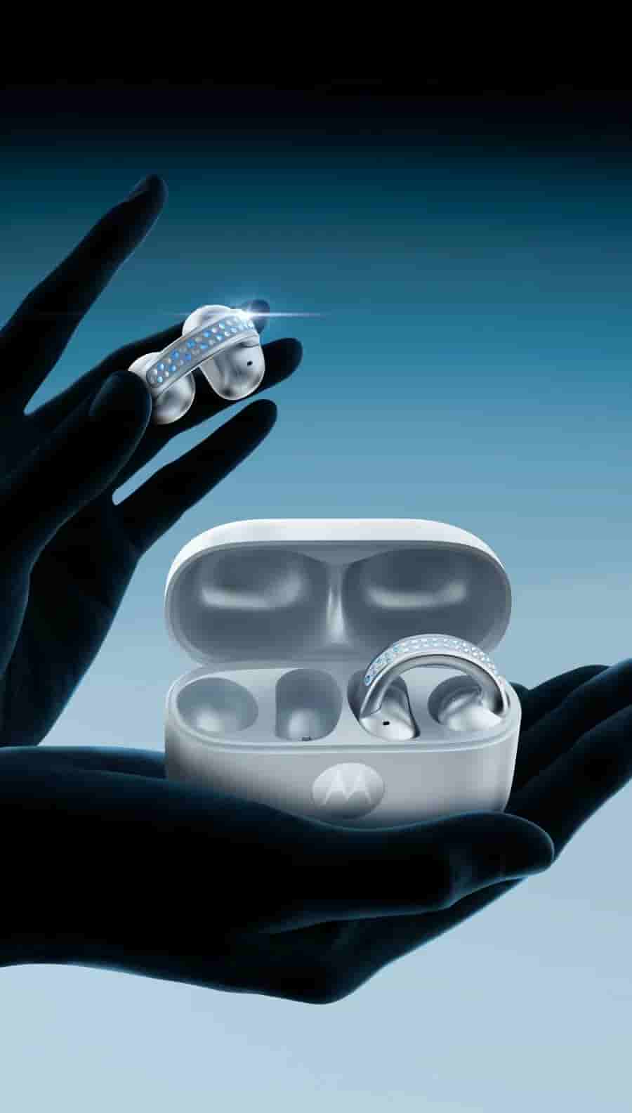 With respect to Motorola’s Razr 2025 smartphone (also called as Razr 60) that debuted back in April 2025, the limited edition Motorola x Swarovski Razr 2025 won’t be having any major design changes, but it will be featuring a fabric rear material with crystals on it, and these crystals can also be spotted near and on the hinge as well – as per the revealed renders. The device is also suggested to have a Bluish White color. Similarly, along with the smartphone, the new Moto Buds Loop can also be found in these revealed renders with the exact same color tone.