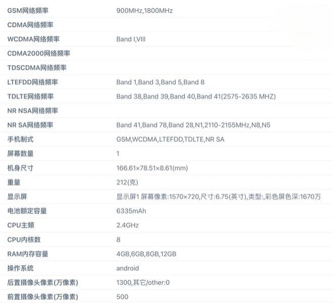 Further, the database reveals some key specs of this mysterious device. The smartphone measures 166.61×78.51×8.61mm and weighs 212g. It features a 6.75-inch display that offers 1570×720 pixel screen resolution and 16.7 million colour depth. It is backed by a 6335 mAh battery. There are four RAM options: 4GB, 6GB, 8GB and 12GB, while two internal storage options: 128GB and 256GB. It features a 13MP rear camera and a 5MP selfie camera.