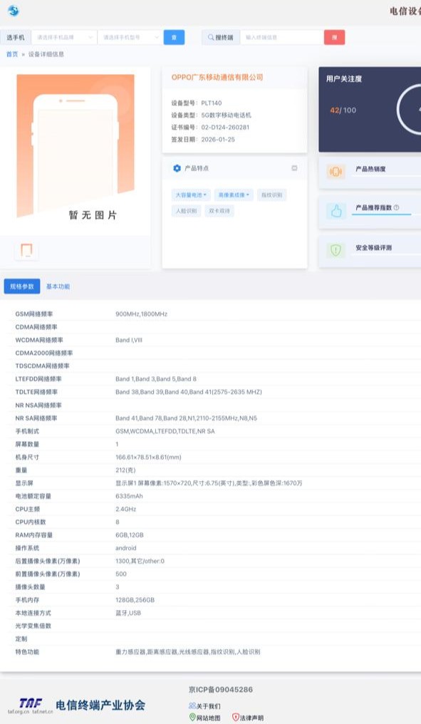 The OPPO device, model number PLT140, features a 6.75″ display with a resolution of 1570 × 720 pixels, supporting 16.7 million colours. It runs Android, though the version is not specified. It uses an octa-core processor clocked at 2.4GHz. The memory options are 6GB and 12GB RAM, with storage options of 128GB and 256GB. Storage can be expanded via a microSD card up to 1TB.