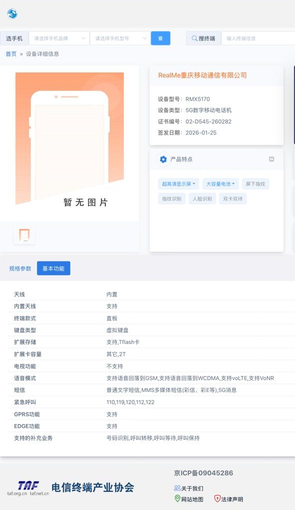 The Realme device, with model number RMX5170, features a 6.67″ OLED display at 1080 × 2372 resolution, supporting 10.7 billion colours. It has an in-display fingerprint sensor. The device runs Android, though the version is unspecified. It’s powered by an octa-core processor at 2.5GHz. Memory options include 6GB, 8GB, 12GB, and 16GB of RAM, with storage options ranging from 128GB to 1TB. It supports TF card expansion up to 2TB.