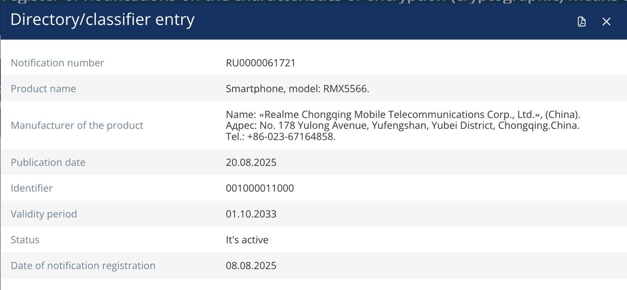 New Realme Smartphone (RMX5566) – EEC and TUV Rheinland Certifications